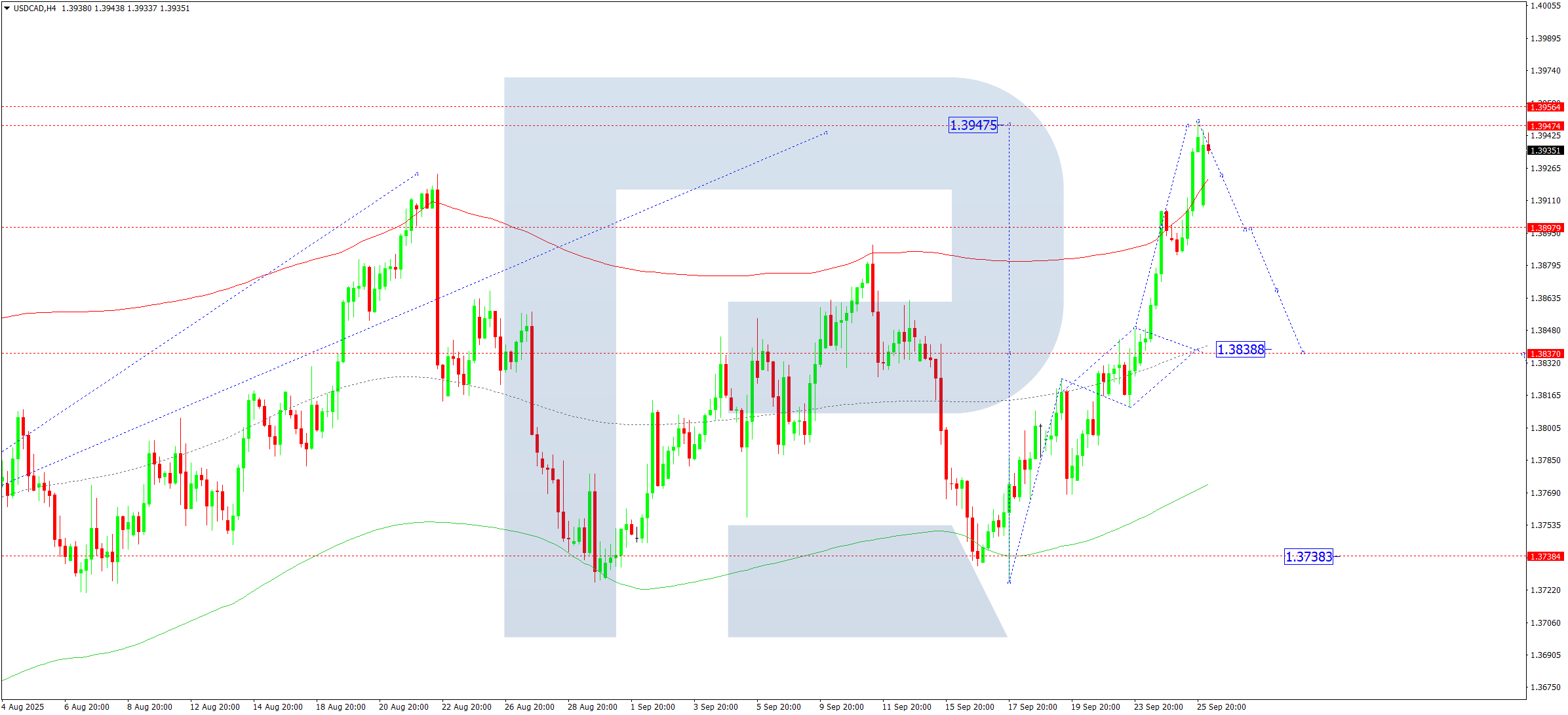 On the H4 chart of USDCAD, the market completed a growth wave to 1.3947. Today, 26 September 2025, a consolidation range is forming below this level. A downward breakout may trigger a correction to 1.3898, with possible extension to 1.3838. After the correction, another upward wave to 1.3950 may develop as a local upward trend target.