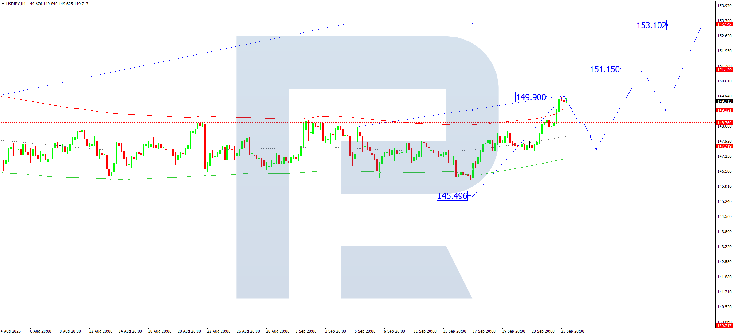 On the H4 chart of USDJPY, the market reached the first growth target at 149.90 and is now consolidating below this level. Today, 26 September 2025, a move downwards is expected, starting a correction to 148.77 at minimum, and possibly extending to 147.77. Afterwards, a new upward wave towards 151.15 is possible, with prospects of continuing the trend to 153.10.