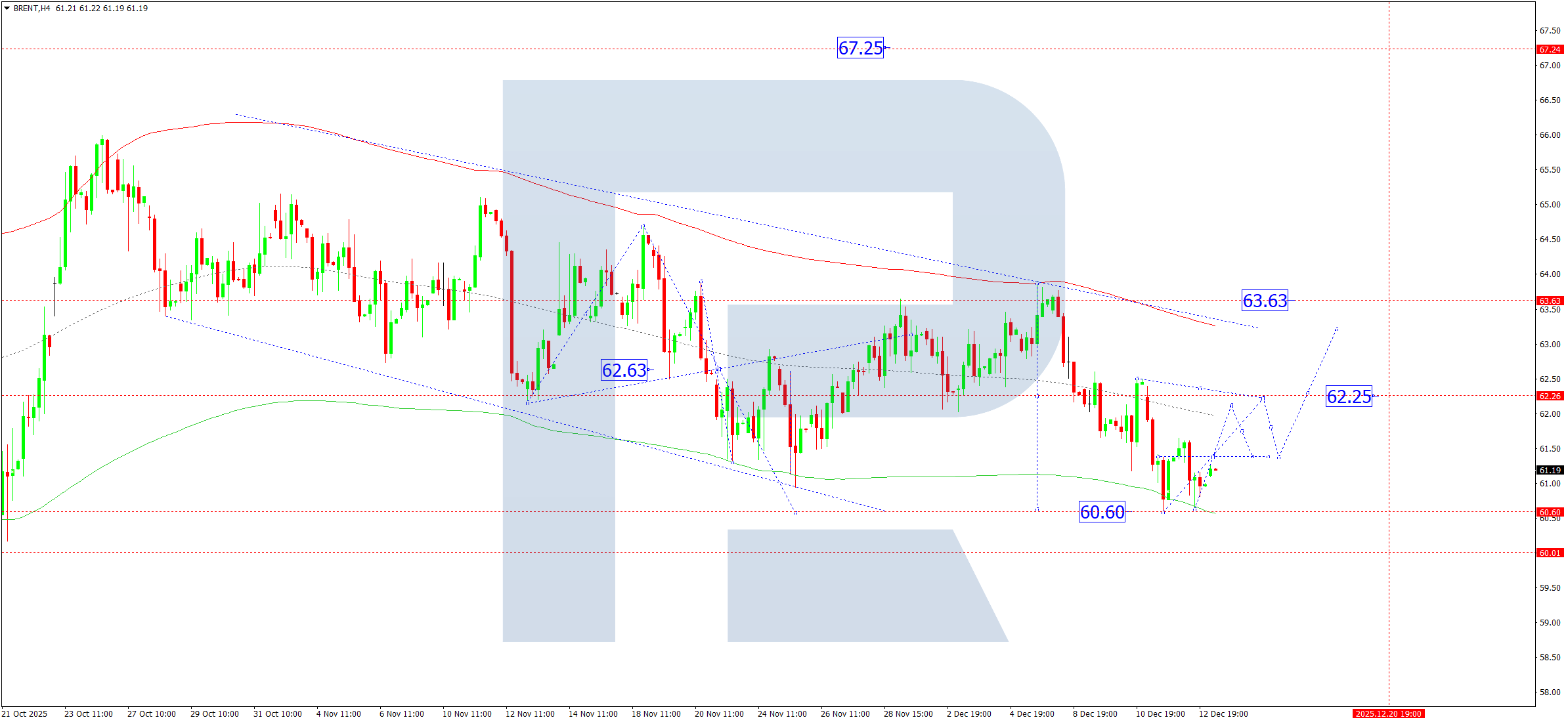 On the H4 chart of Brent crude, the market has completed a downward wave to 60.60. Today, 15 December 2025, we expect the development of a new consolidation range above this level. If the price breaks upwards, it opens the potential for the start of a rising wave towards 62.62. A breakout above this level will open the potential for a continuation of the trend towards 63.63.