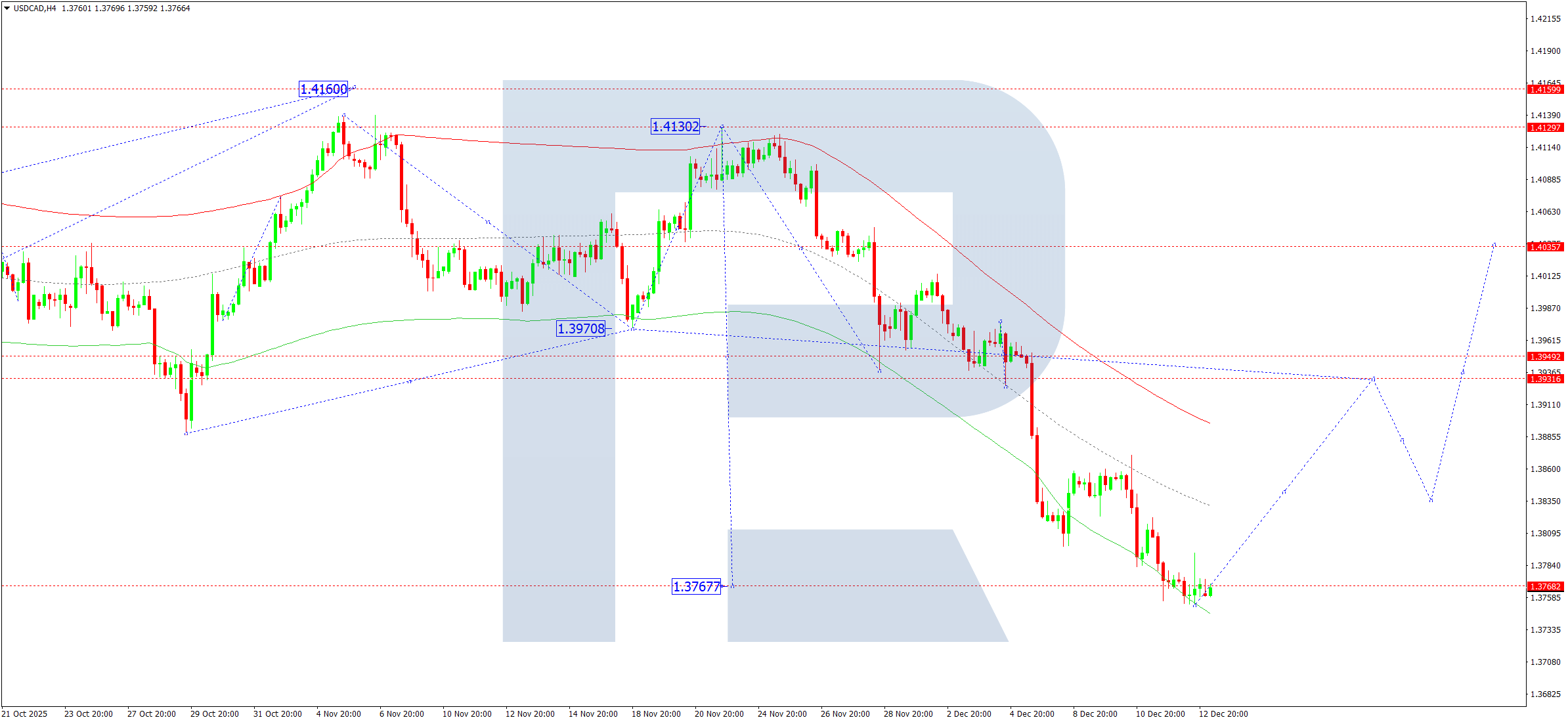 On the H4 chart of USDCAD, the market has completed a downward wave to 1.3767. Today, 15 December 2025, a compact consolidation range has formed above this level. We expect an upward breakout towards 1.3939. Later, we will consider the probability of extending the correction towards 1.3844. After this correction completes, we will consider the start of a new upward wave towards 1.4040. This target remains local.