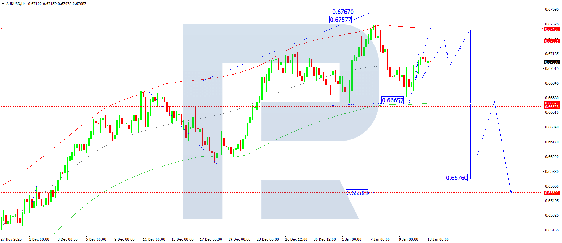 On the AUDUSD H4 chart, the market is forming a consolidation range around the 0.6700 level. Today, 13 January 2026, an upward move to 0.6733 is expected. Further decline towards the 0.6600 level is then expected, with the prospect of trend continuation to 0.6577.