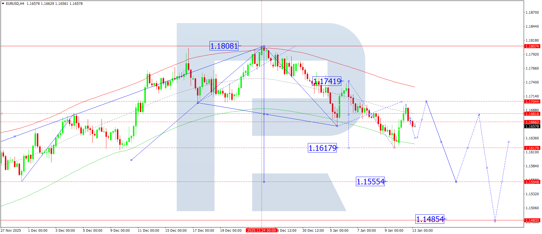 On the EURUSD H4 chart, the market continues to develop a correction of the second downward impulse. Today, 13 January 2026, a downward structure is forming towards the 1.1636 level. Further growth to 1.1704 cannot be ruled out. At this point, the corrective potential will be exhausted. After the correction is complete, a new downward impulse is expected to begin, aiming for the 1.1555 level as the first target.