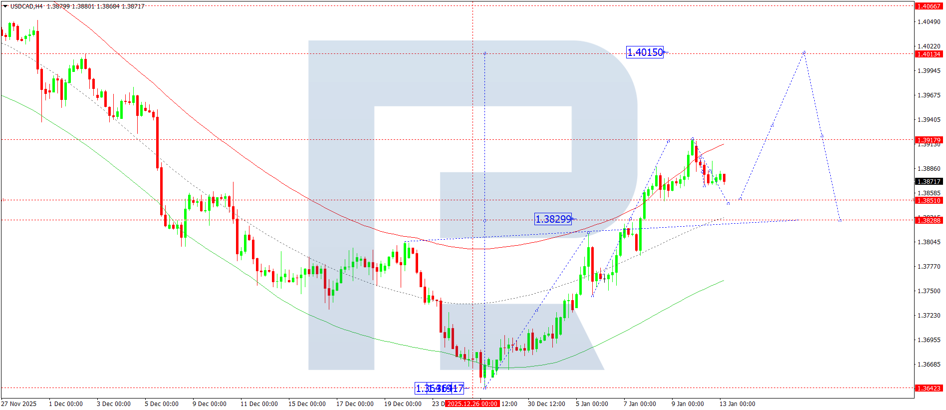 On the USDCAD H4 chart, the market has completed an upward wave to the local target of 1.3918. Today, 13 January 2026, a correction towards the 1.3850 level is expected. After this correction is complete, a new upward wave could begin, aiming for 1.4010 as the first target.