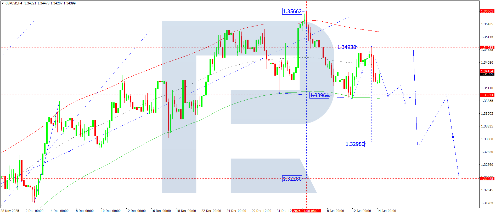 On the GBPUSD H4 chart, the market continues to develop a downward wave towards the 1.3393 level. Today, 14 January 2026, the pair is expected to reach this target. Further growth towards 1.3494 is expected. At this point, the corrective potential will be exhausted. After that, it is appropriate to consider the start of a downward wave towards the 1.3300 level, a local target.