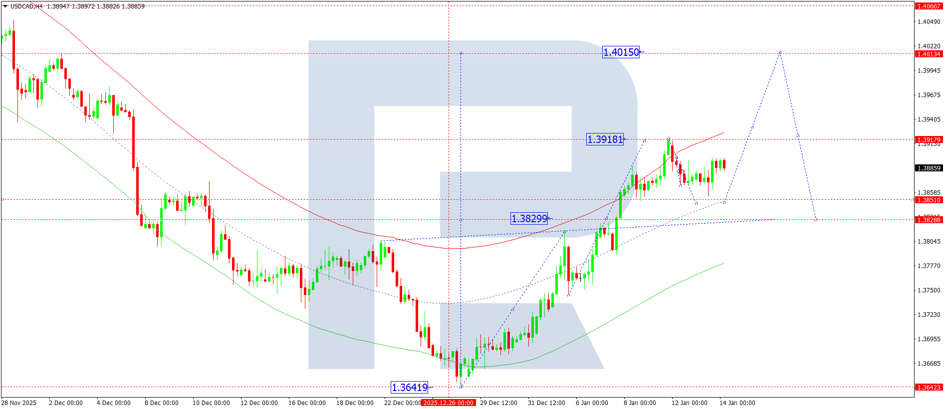 On the USDCAD H4 chart, the market is forming a consolidation range around the 1.3883 level. Today, 14 January 2026, a decline towards the 1.3850 level is expected. After this correction completes, a new upward wave towards the 1.4010 level could start. This is the first target.