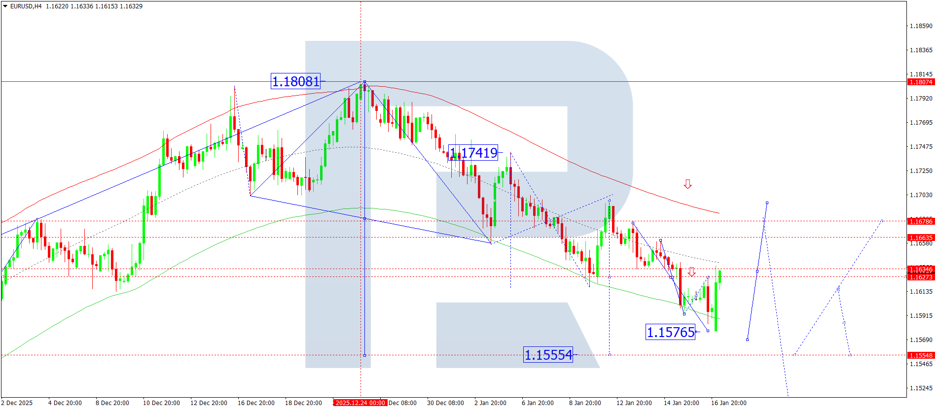 On the EURUSD H4 chart, the market completed a downward wave to the 1.1575 level. Today, 19 January 2026, a correction towards 1.1636 has formed. It is relevant to consider the development of a downward wave towards the 1.1555 level as the first target. After reaching this target level, the pair could undergo a correction towards the 1.1700 level.