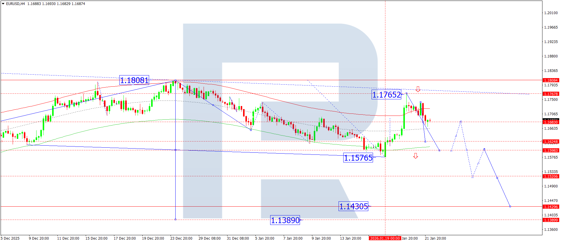 On the EURUSD H4 chart, the market is forming a consolidation range around the 1.1683 level. Today, 22 January 2026, a downside breakout from this range is possible, with the target at 1.1628. A breakout below this level would open the potential for a decline towards 1.1590.