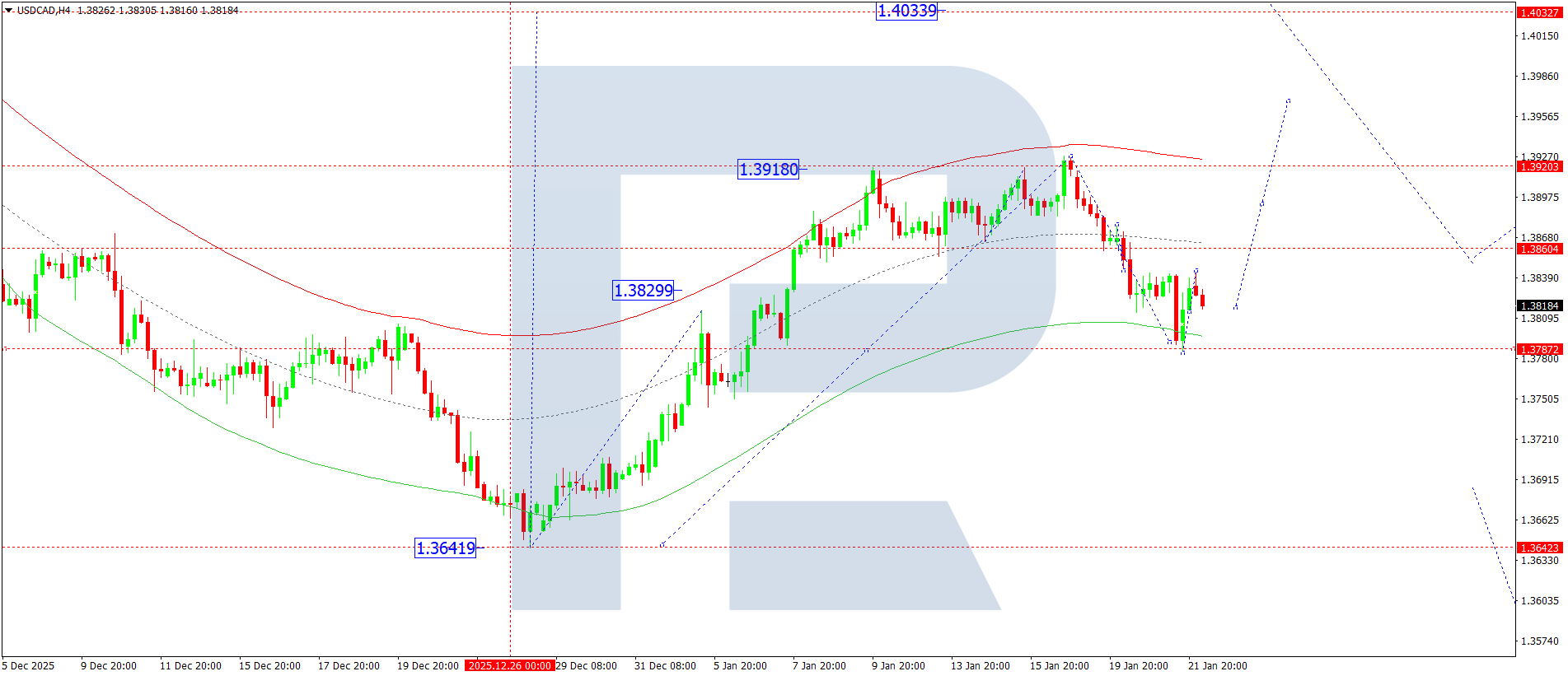 On the USDCAD H4 chart, the market completed a downward wave to the 1.3785 level. Today, 22 January 2026, a new upward wave is expected to begin, aiming for 1.3860 and possibly extending to 1.4010 as the first target.