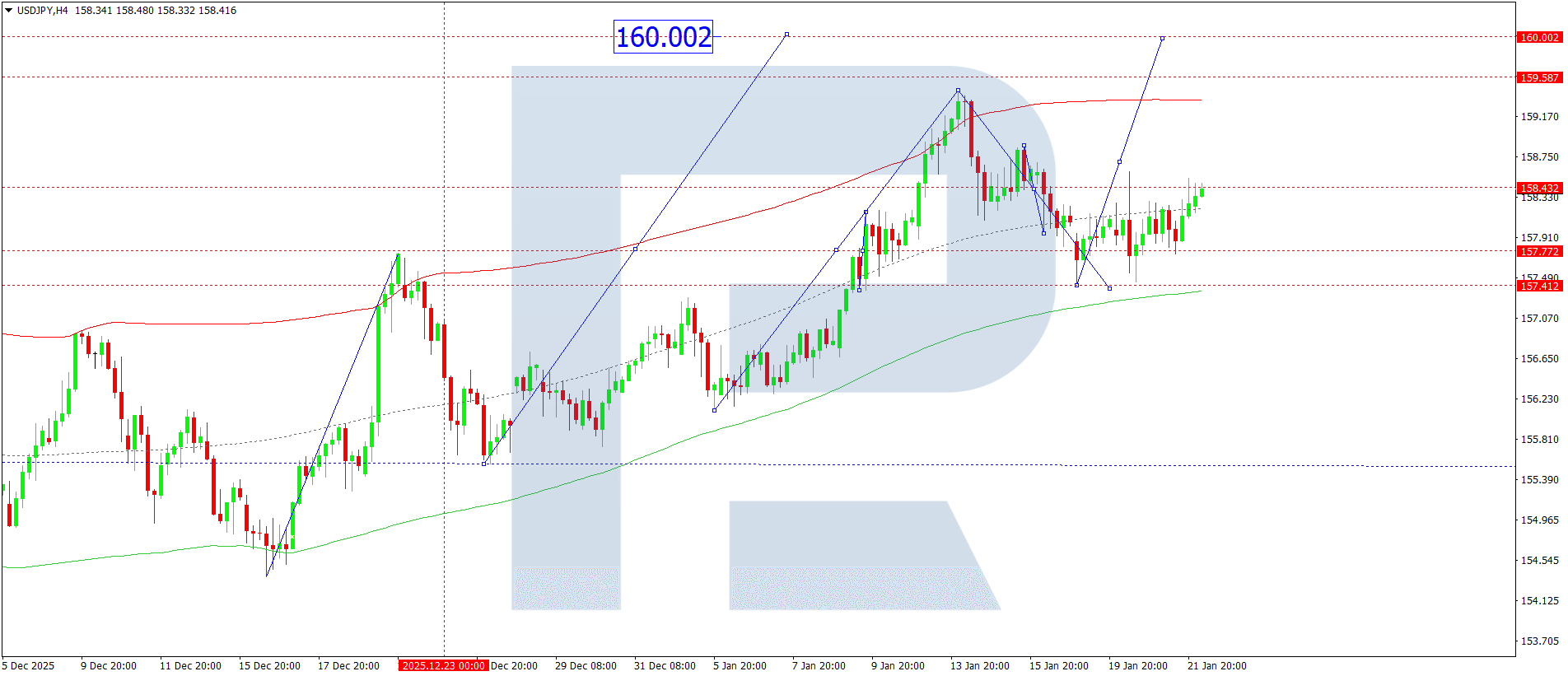 On the USDJPY H4 chart, the market continues to develop a consolidation range around the 158.15 level. Today, 22 January 2026, a downside breakout from the range would open the potential for a wave towards 156.81. Conversely, an upside breakout from the range could trigger a wave towards the 160.00 level.