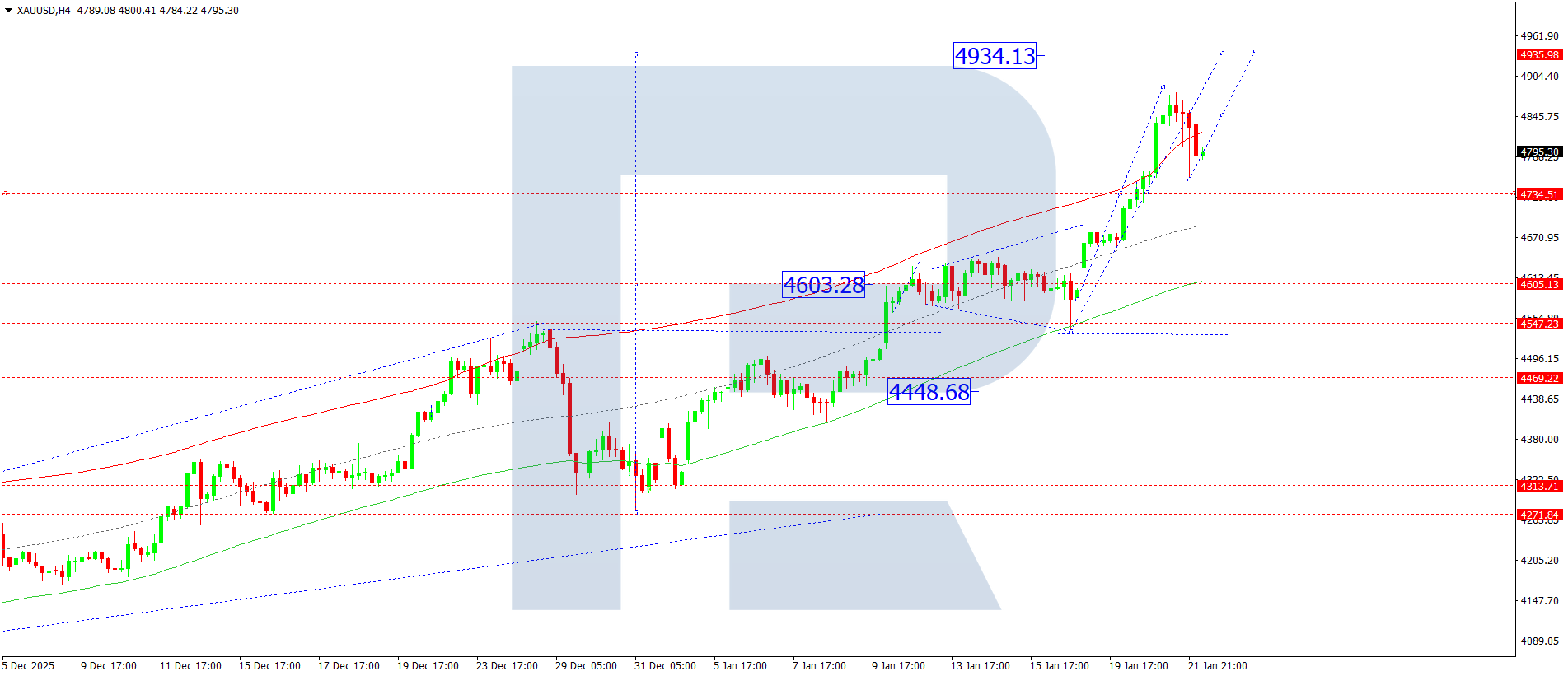 On the XAUUSD H4 chart, the market is completing a corrective move towards the 4,755 level and continues to develop an upward wave towards 4,933. Today, 22 January 2026, prices are expected to reach this target level. Further, a corrective move towards 4,735 is possible, followed by growth towards 5,030.