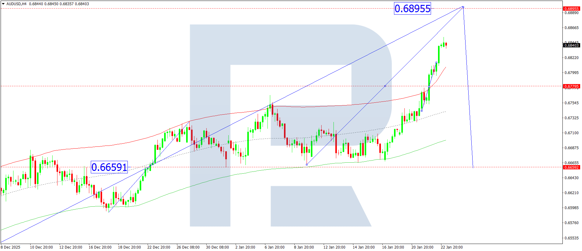 On the AUDUSD H4 chart, the market continues to rise towards the 0.6890 level. Today, 23 January 2026, the pair is expected to reach this target level. After that, a downward wave towards 0.6777 could begin. Further, growth towards the 0.6900 level is possible.