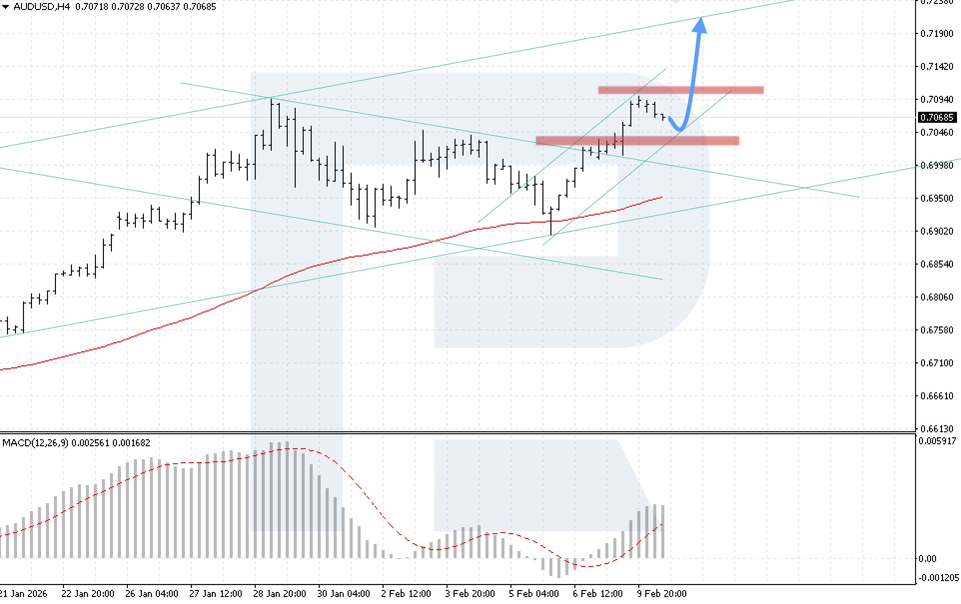 On the AUDUSD H4 chart, the market is showing a correction after rebounding from the 0.7095 resistance level; however, buying pressure remains. Today, 10 February 2026, the bullish momentum could continue towards the target of 0.7195 after a rebound from the 0.7045 support level.