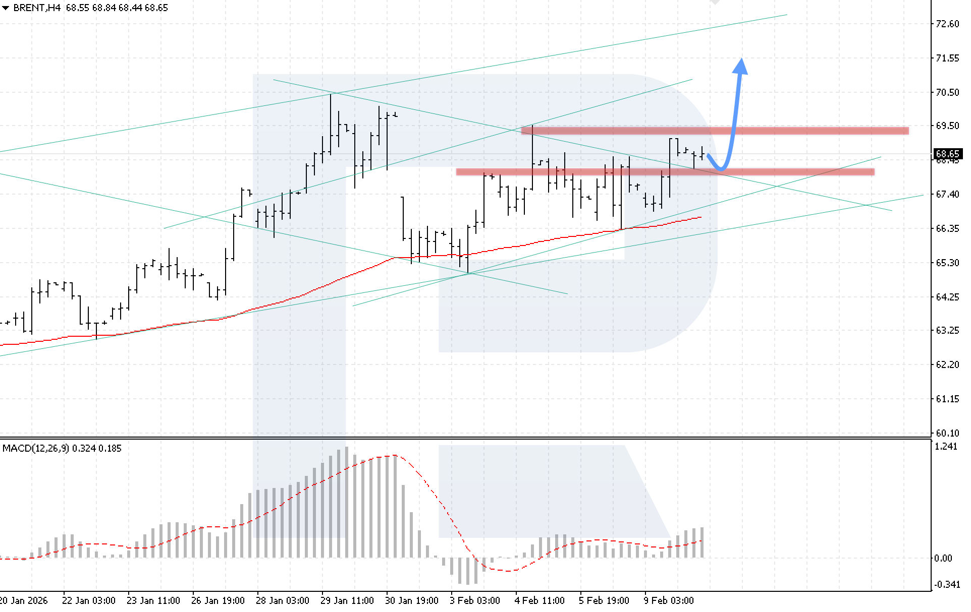 On the Brent H4 chart, the market completed a small growth wave, which allowed buyers to consolidate above the upper boundary of the downward channel. The nearest resistance level is located at 69,50. Today, 10 February 2026, the upward wave could continue with a target at 71,55 after a rebound from the upper boundary of the broken channel.