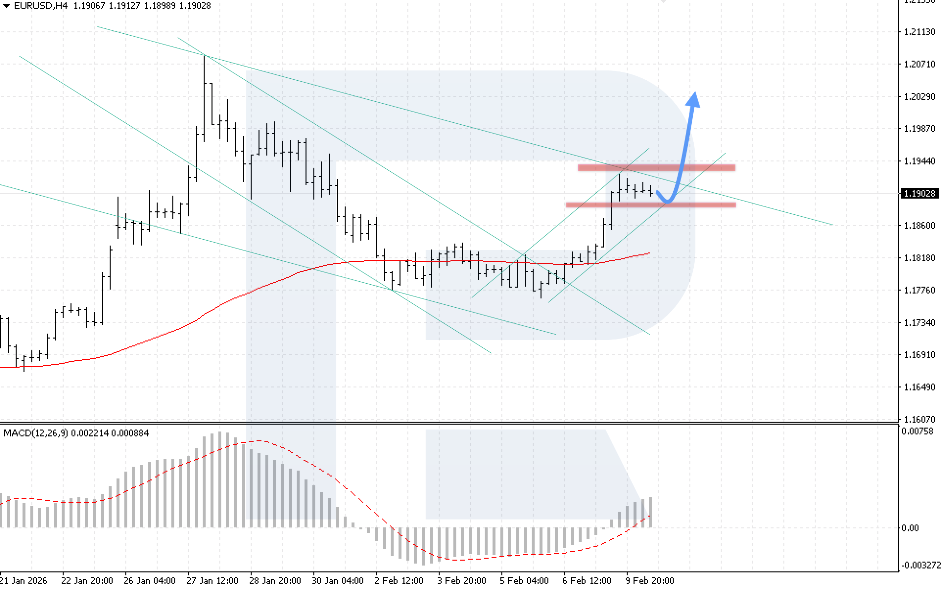 On the EURUSD H4 chart, the market is rebounding from the upper boundary of the downward channel. Despite the current correction, buying pressure remains significant. Today, 10 February 2026, the baseline scenario suggests a rebound from the lower boundary of the upward channel at 1.1895, followed by a new bullish wave with a target at 1.2030.