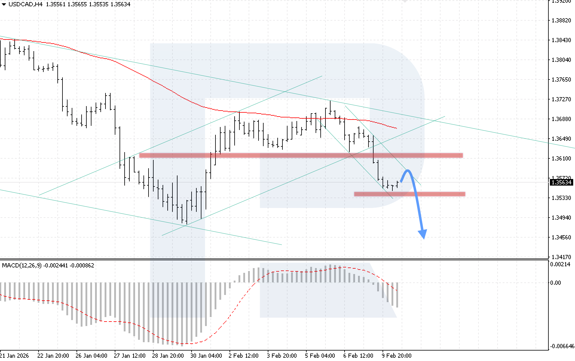 On the USDCAD H4 chart, the market continues to decline within a strong downward impulse after breaking the lower boundary of the Double Top reversal pattern. Today, 10 February 2026, the baseline scenario suggests a continued decline with a target at 1.3455.