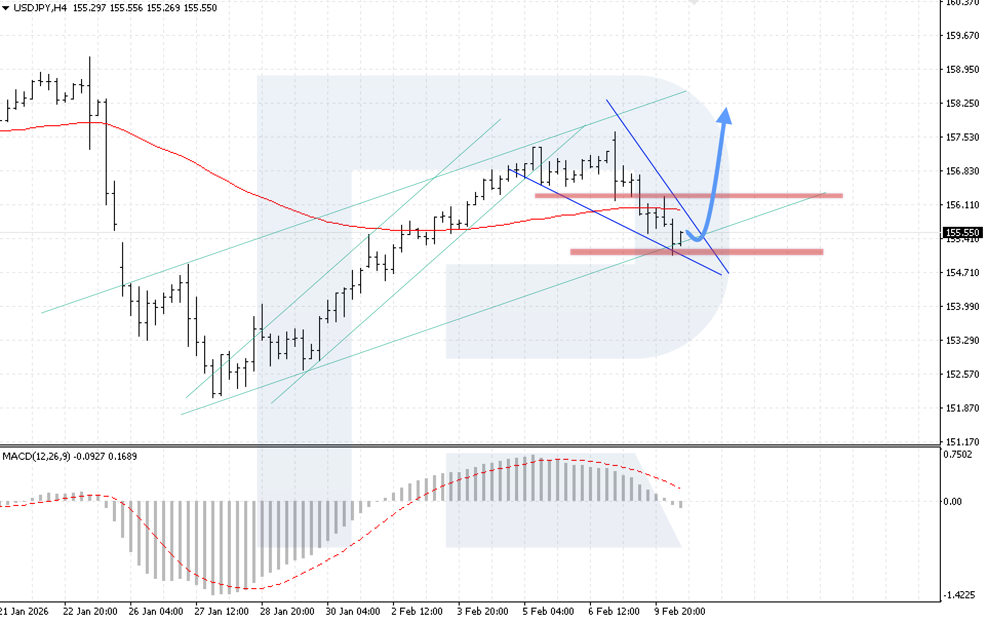 On the USDJPY H4 chart, the market is in a phase of active bearish correction. Despite prices moving below the EMA-85, the potential for forming a Wedge reversal pattern remains. The nearest support zone is located in the 154.90 area. Today, 10 February 2026, the baseline scenario suggests renewed growth with a target at 158.25 following the reversal pattern signal.