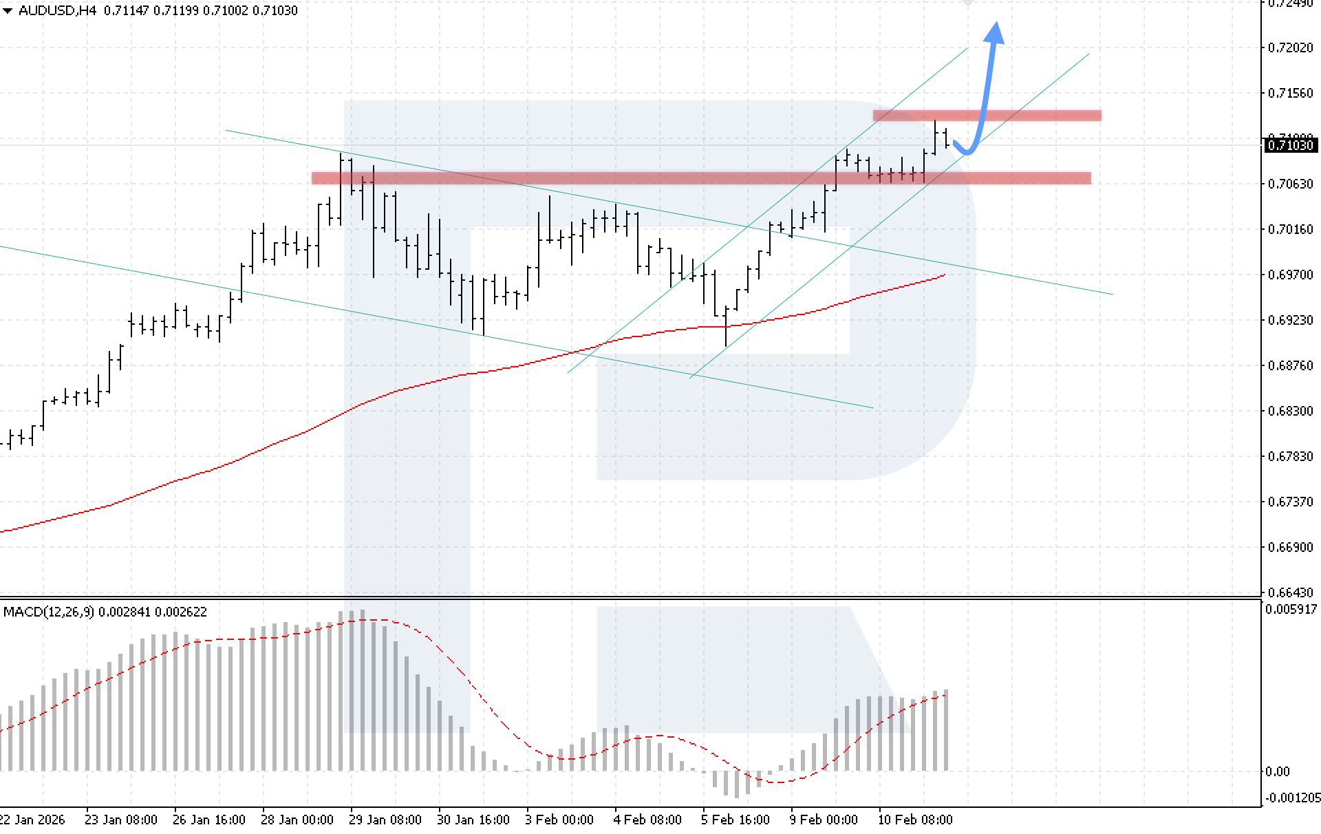 On the AUDUSD H4 chart, the market is showing a correction after breaking above the resistance level, while prices remain within the ascending channel. Today, 11 February 2026, the baseline scenario suggests continued bullish momentum after a rebound from the channel boundary, with a target at 0.7215.
