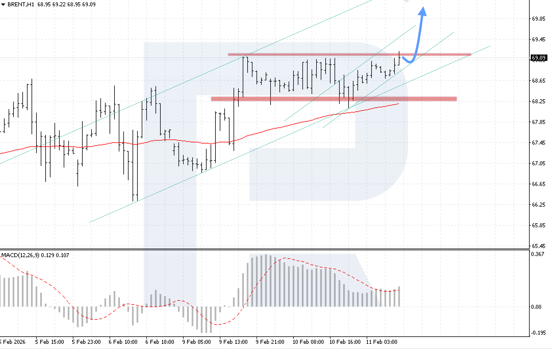 On the Brent H4 chart, the market continues to rise within a bullish channel, with buyers testing the key resistance level at 69.10. Today, 11 February 2026, the baseline scenario suggests continued upward movement after a rebound from the lower boundary of the channel, with a target at 70.45.