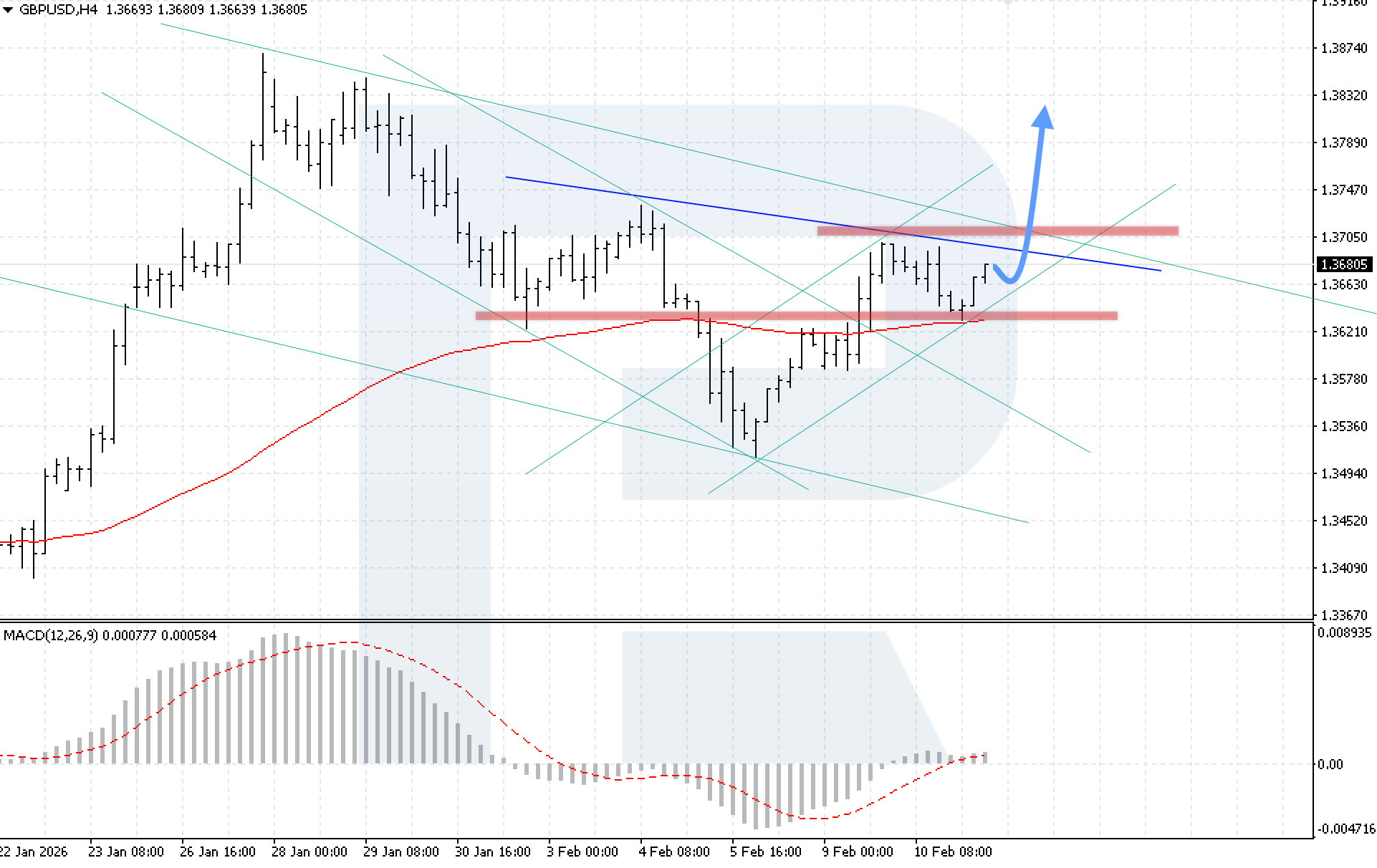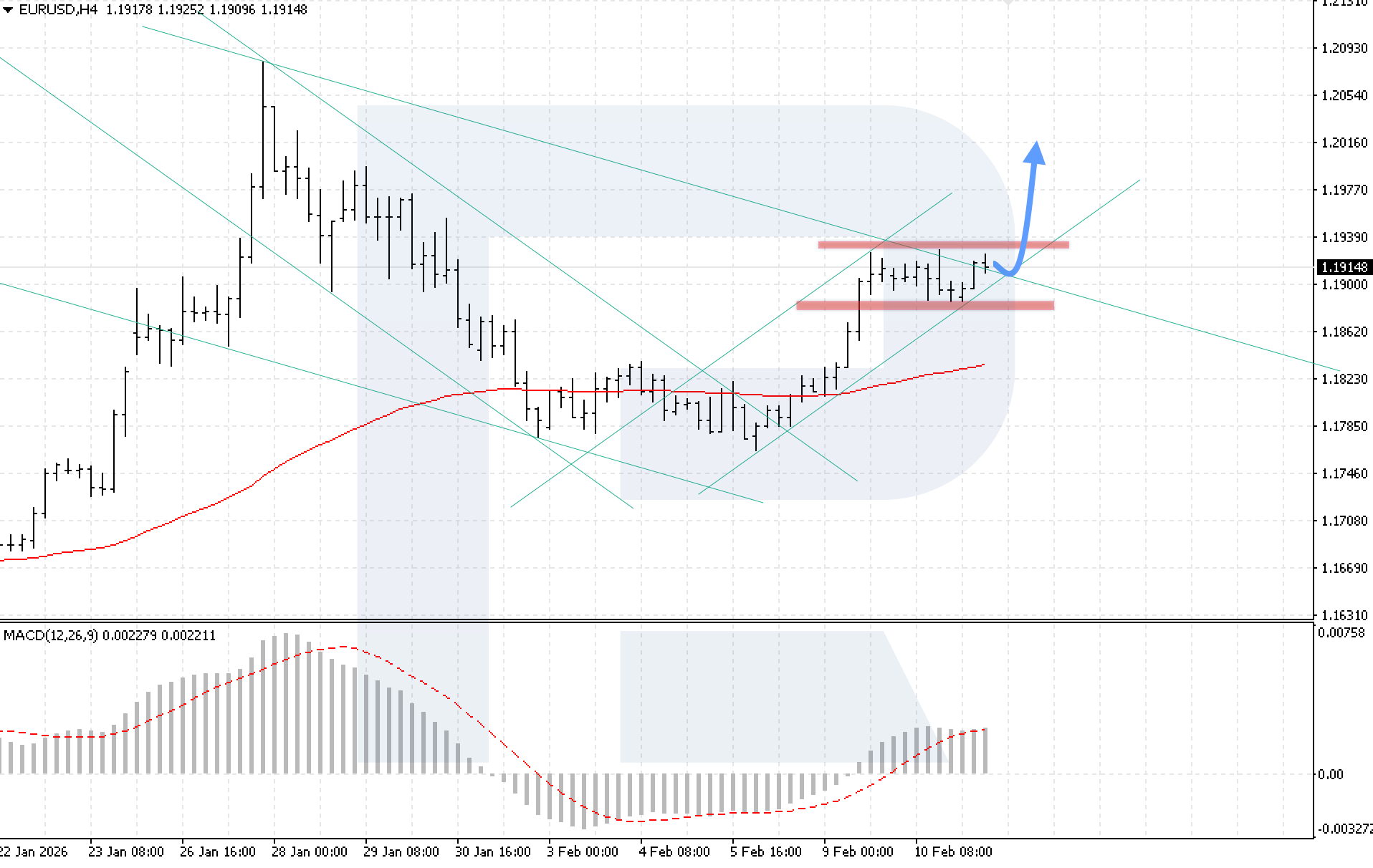 On the EURUSD H4 chart, the market is moving in a consolidation phase. Buyers are attempting to secure positions above the upper boundary of the long-term descending channel. Today, 11 February 2026, the baseline scenario remains a rebound from the channel boundary in the 1.1905 area, followed by an upward wave towards 1.2015.