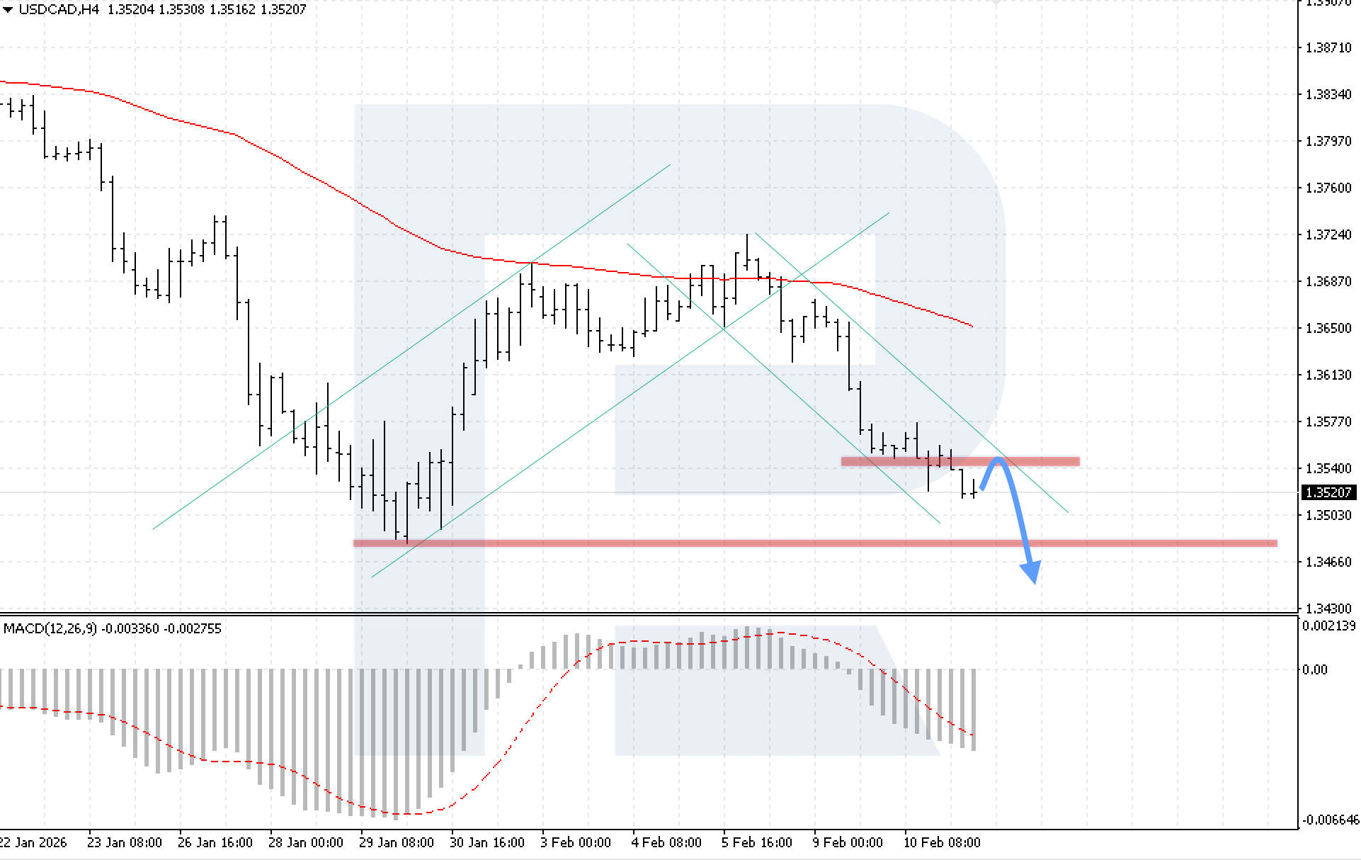 On the USDCAD H4 chart, the market continues to fall sharply within a strong bearish momentum. Today, 11 February 2026, the baseline scenario suggests a continued decline with a target at 1.3455 after a rebound from the 1.3535 resistance level.