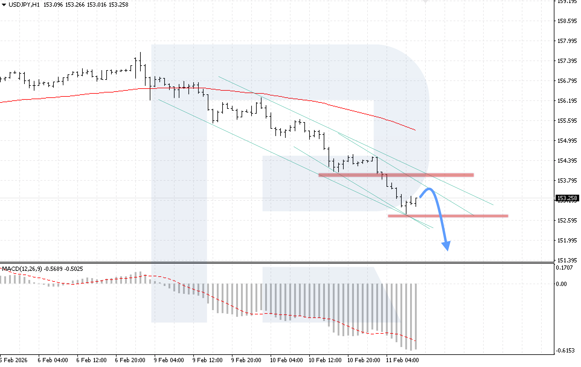 On the USDJPY H4 chart, the market is showing an active decline within a descending channel. The nearest support zone is located at 152.60. Today, 11 February 2026, the baseline scenario suggests a continued decline, with a target at 151.65.