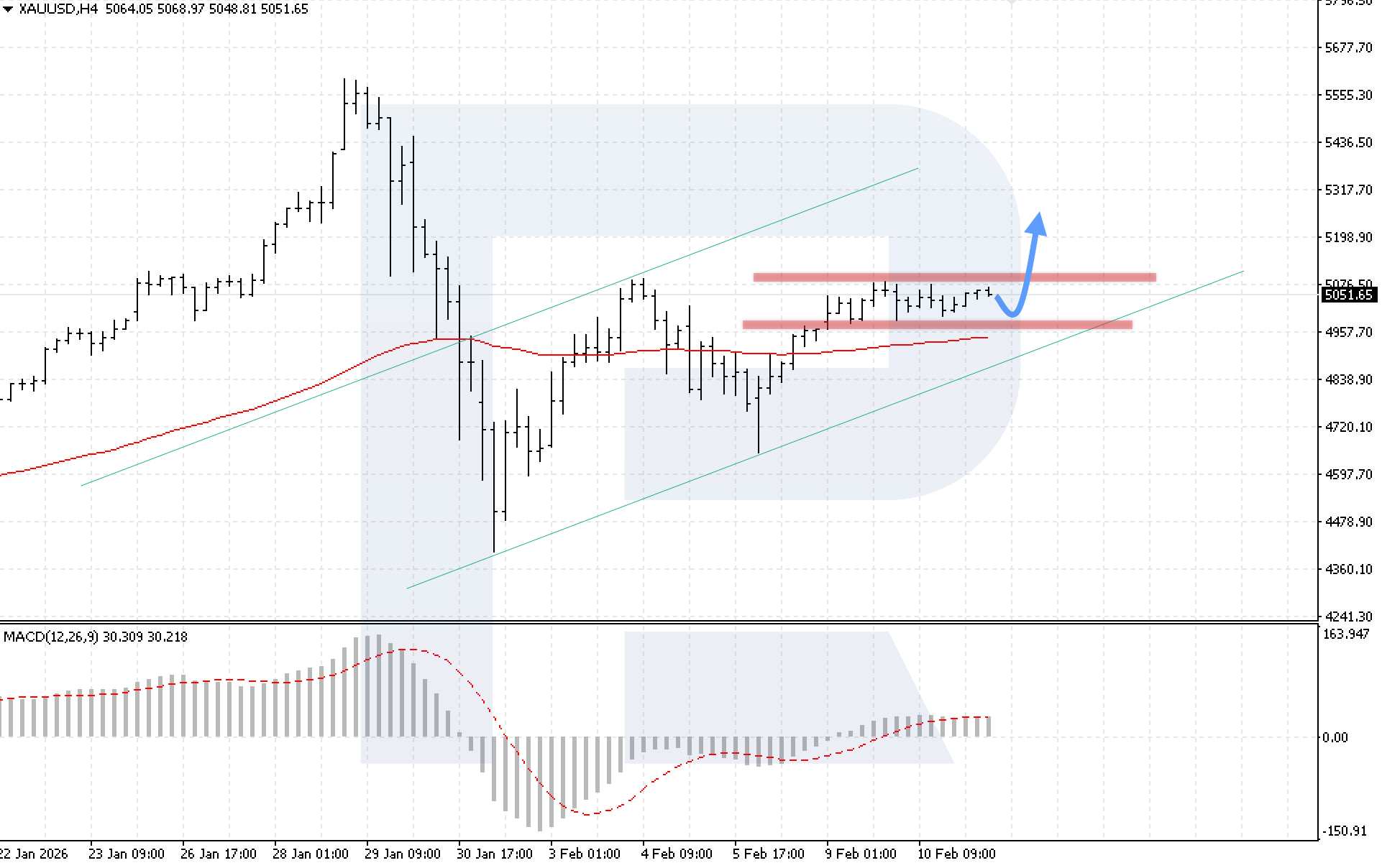 On the XAUUSD H4 chart, the market continues to test the 5,075 resistance level actively, indicating increasing bullish pressure. Today, 11 February 2026, the baseline scenario suggests further growth after a rebound from the 4,960 support level, with a target at 4,845.