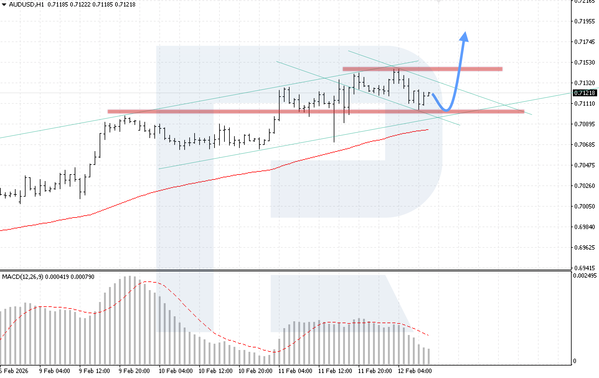 On the H4 chart of the AUDUSD currency pair, the market continues to correct, while prices remain above the EMA-85, indicating sustained bullish pressure. Today, 12 February 2026, the baseline scenario suggests continued bullish momentum after a rebound from the lower channel boundary, with a target at 0.7185.