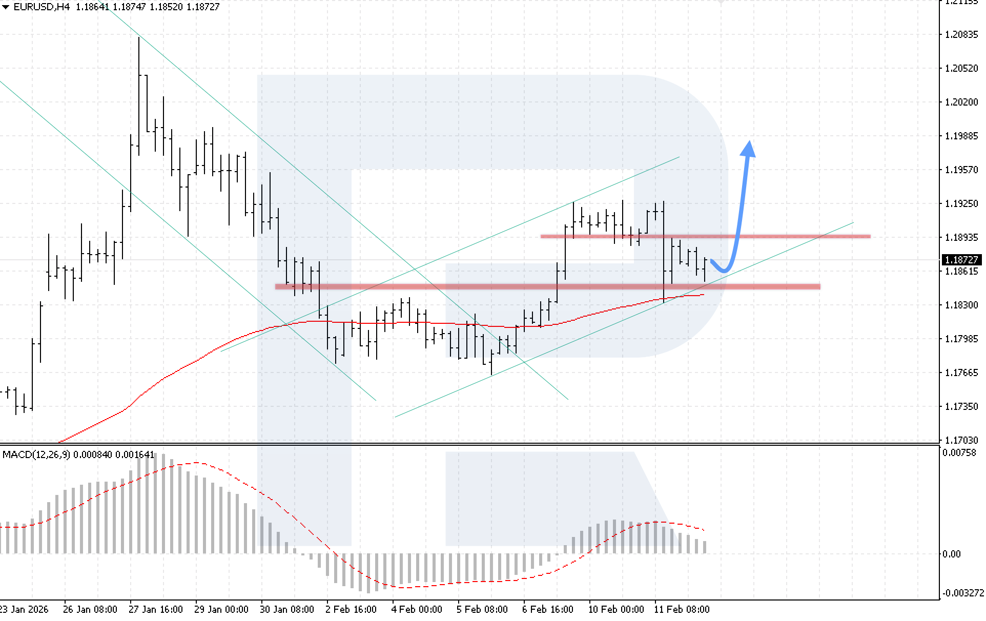 The technical picture confirms this scenario. The MACD indicator shows a slowdown in histogram decline, while prices have tested the 1.1840 support level twice, which may indicate the formation of a Double Bottom reversal pattern. The key condition for continued growth will be confident consolidation above 1.1905, signalling a breakout above the upper boundary of the reversal pattern and confirming the resumption of bullish movement.