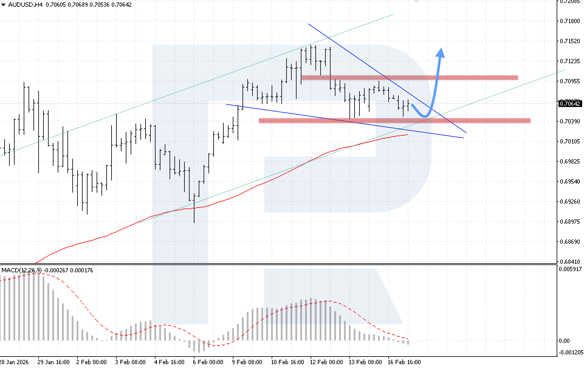 The technical picture confirms this scenario. The MACD indicator shows slowing histogram decline, and a Wedge reversal pattern is forming, strengthening the potential for upward movement. The key condition for growth will be consolidation above 0.7085, indicating a breakout above the upper boundary of the formation.