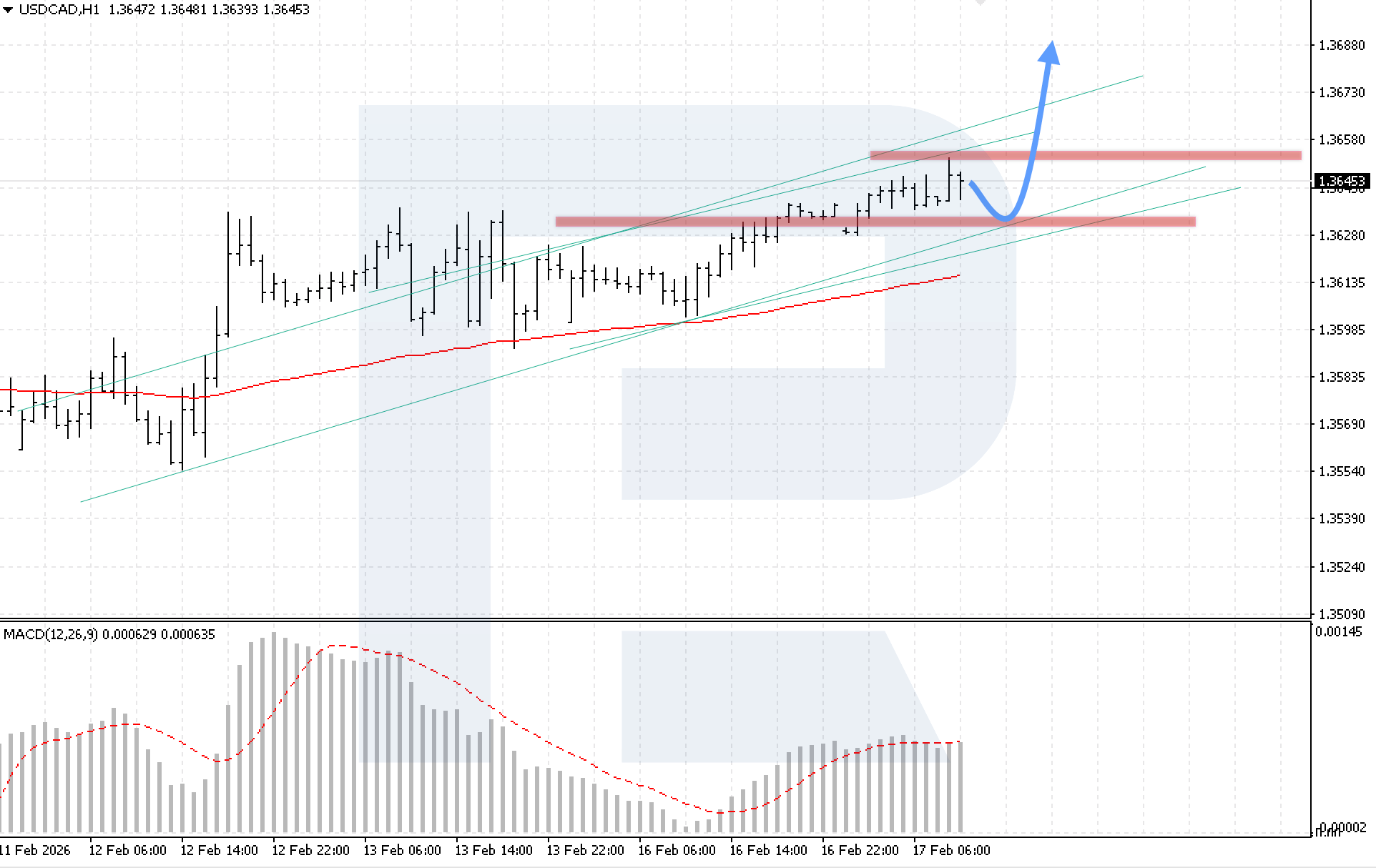 On the H1 chart of the USDCAD currency pair, the market continues its upward movement within a bullish channel. Buyers have confidently overcome local resistance. Today, 17 February 2026, the baseline scenario suggests continued upward movement after a rebound from the lower boundary of the channel, with a target at 1.3685.