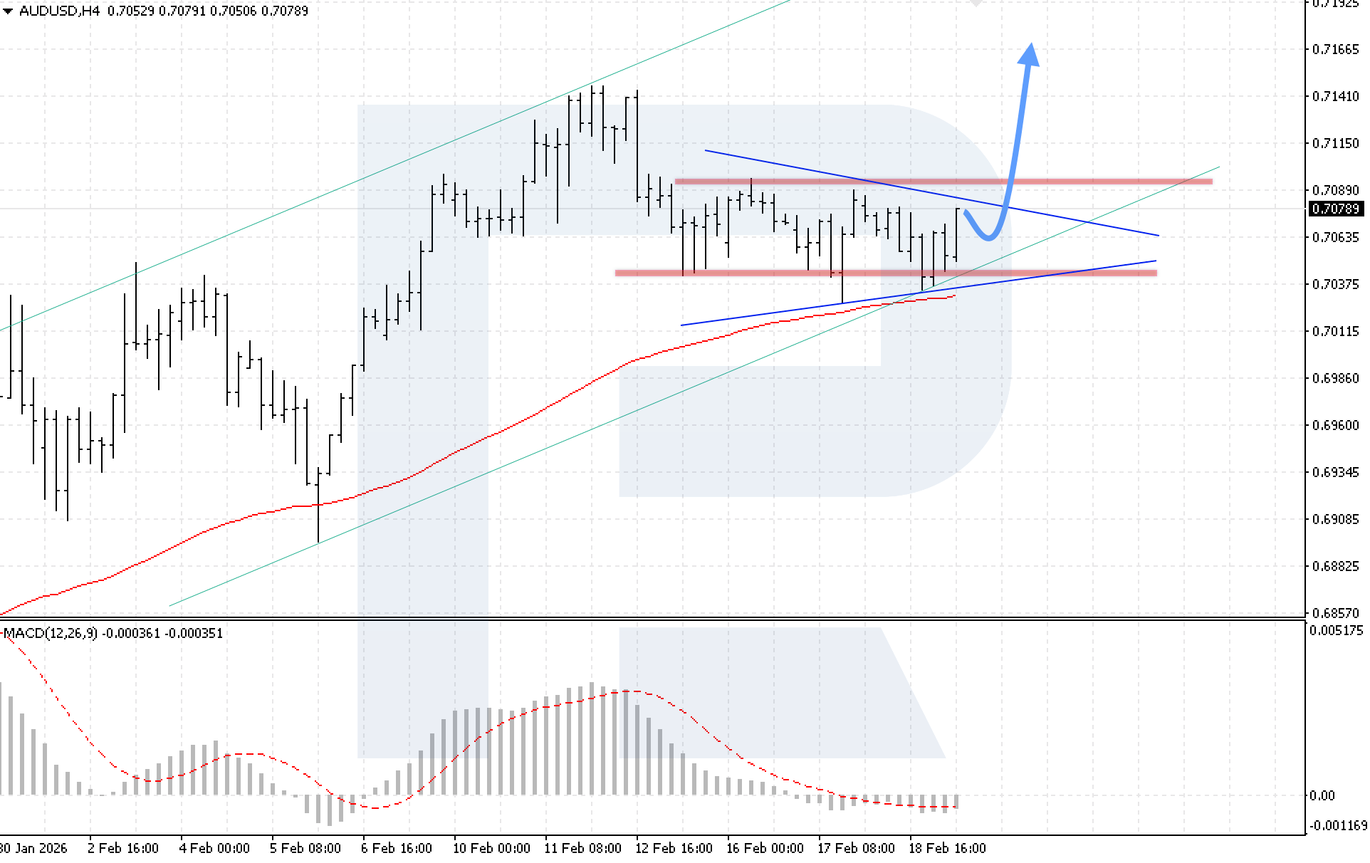 The technical picture confirms this scenario. The MACD indicator shows growth in the histogram, and the signal line is about to cross it, indicating strengthening bullish momentum. The key condition for growth will be consolidation above 0.7090, confirming a breakout above the upper boundary of the pattern and opening the way towards higher targets.