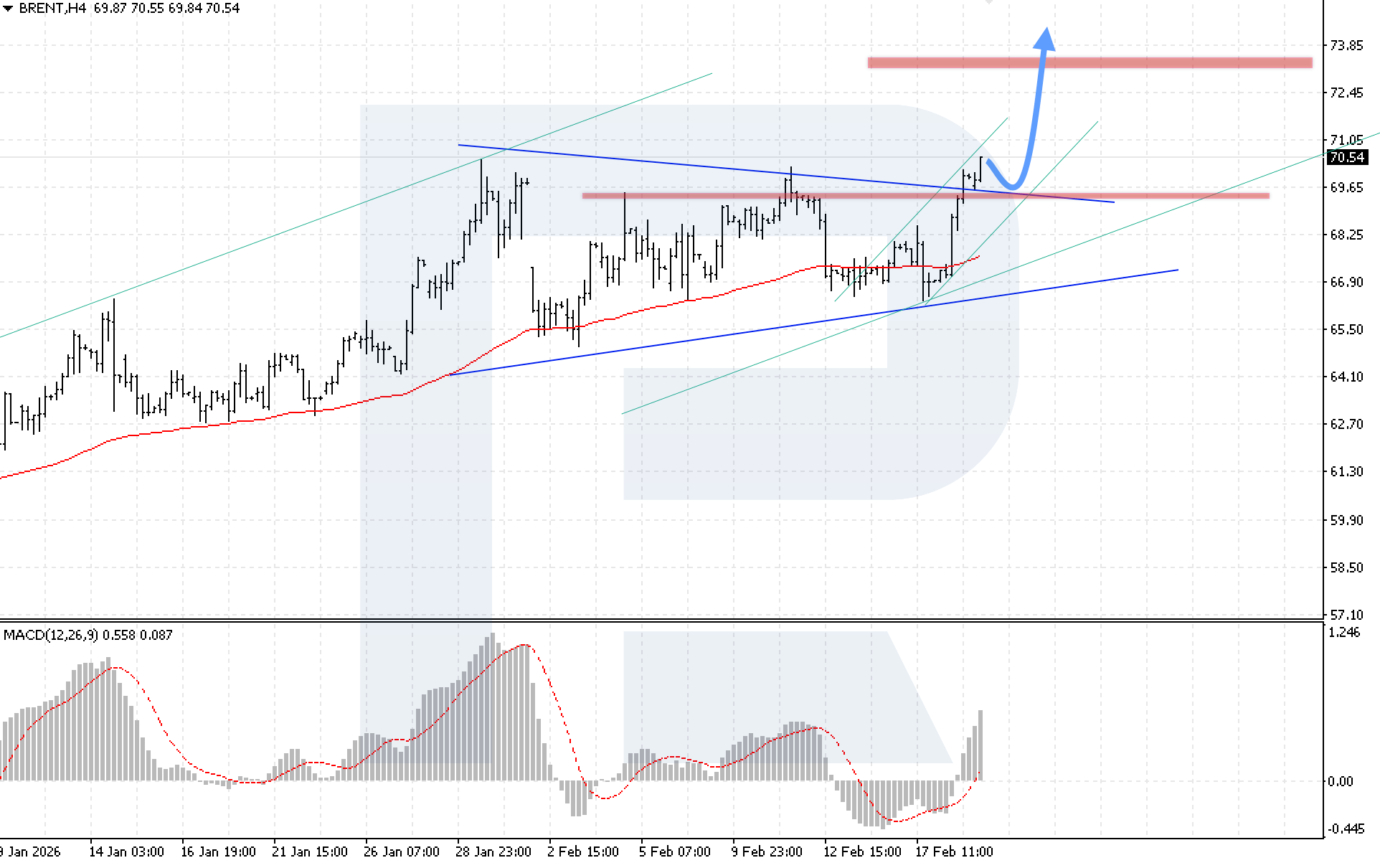 On the H4 chart of Brent crude oil, the market continues to rise sharply after breaking above the upper boundary of the Triangle pattern. Today, 19 February 2026, the baseline scenario suggests a rebound from the broken boundary of the pattern, followed by growth towards 73.85.