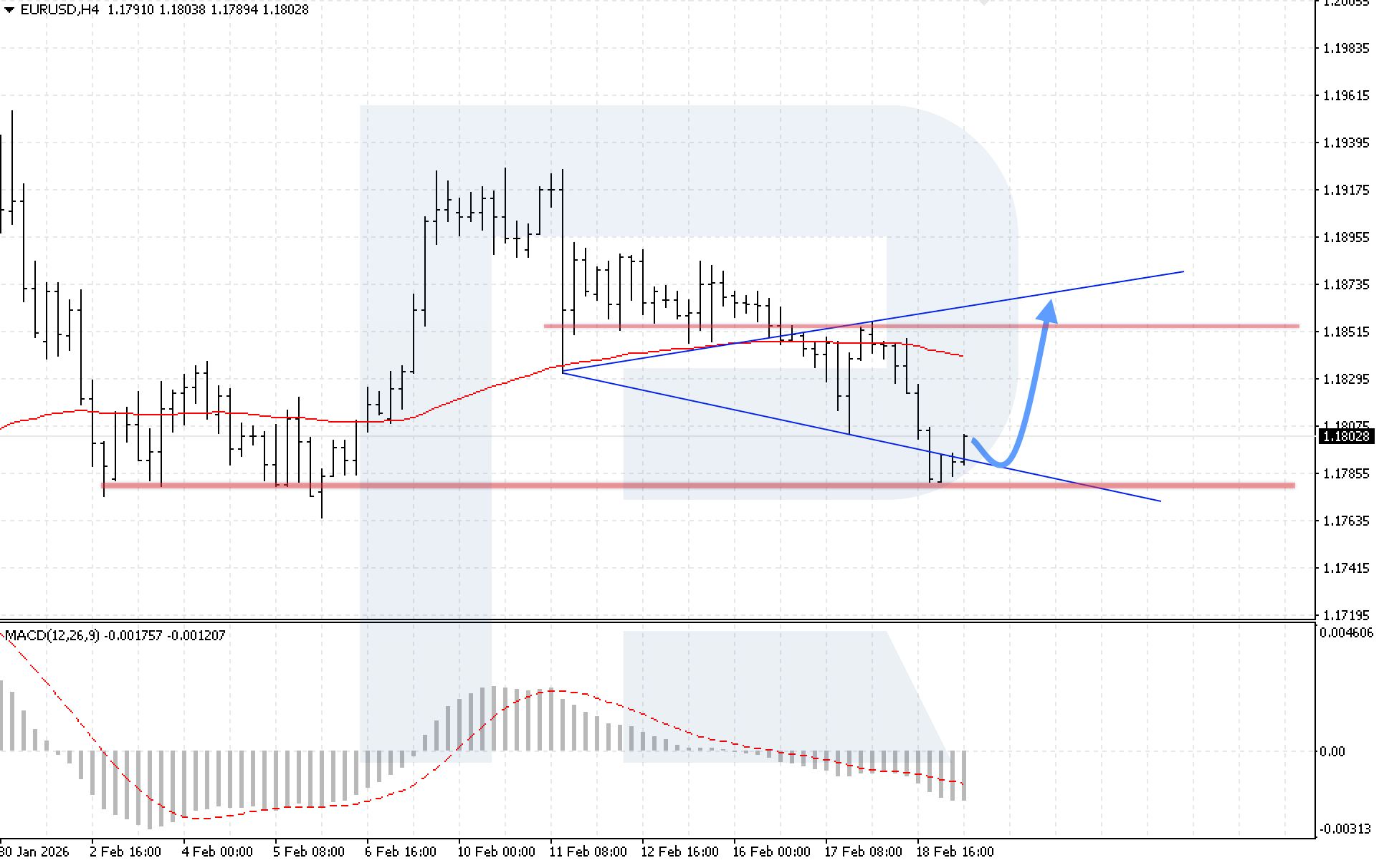 The technical picture supports this scenario. The MACD histogram is rising after a prolonged decline, indicating weakening bearish pressure. The key condition for further upside will be firm consolidation above the local resistance level at 1.1825.