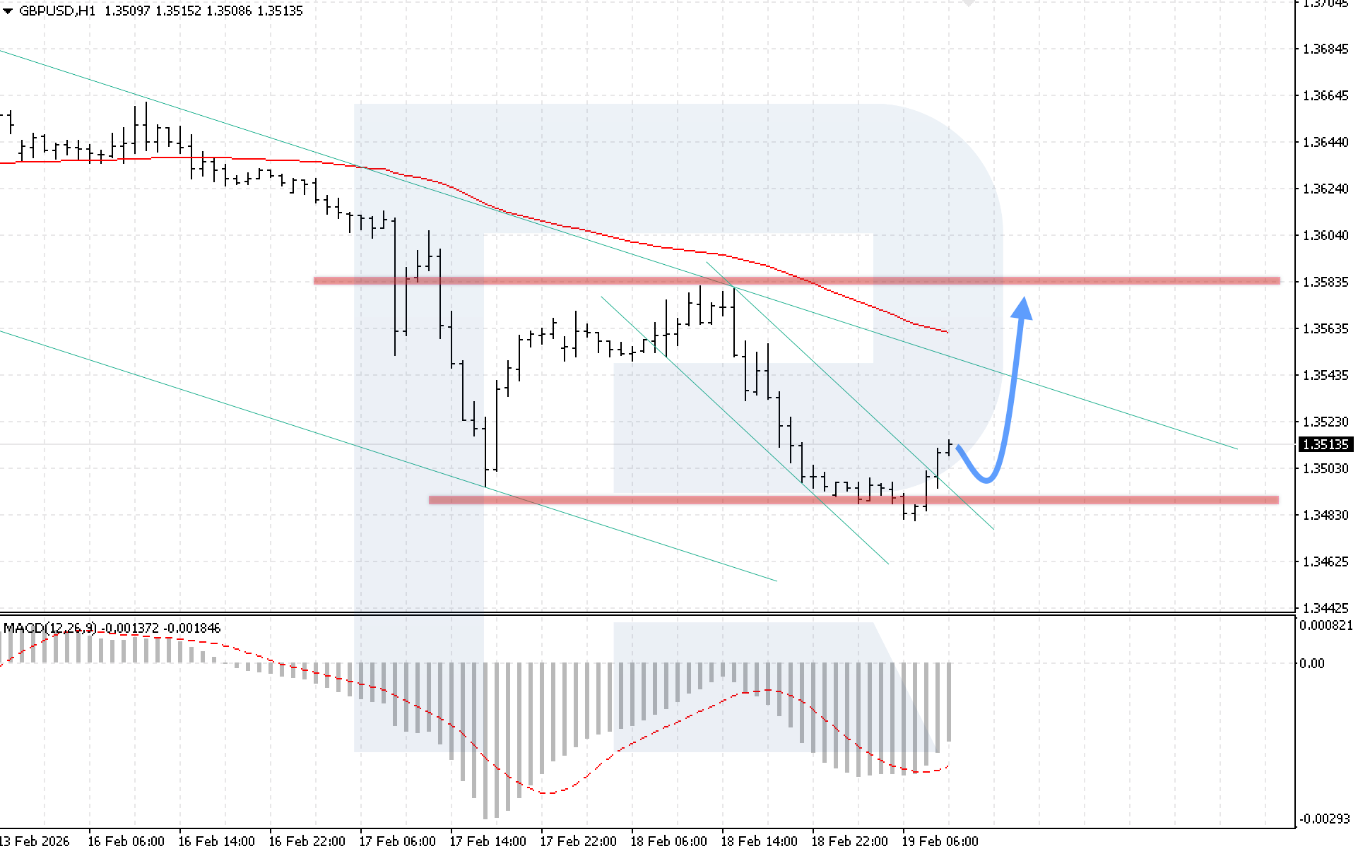 On the H1 chart of the GBPUSD currency pair, quotes are moving upwards and forming a Double Bottom reversal pattern. Prices have already exited the descending channel, indicating bullish pressure near the key support level. Today, 19 February 2026, the baseline scenario suggests a rebound from the channel’s upper boundary, followed by growth towards 1.3575.