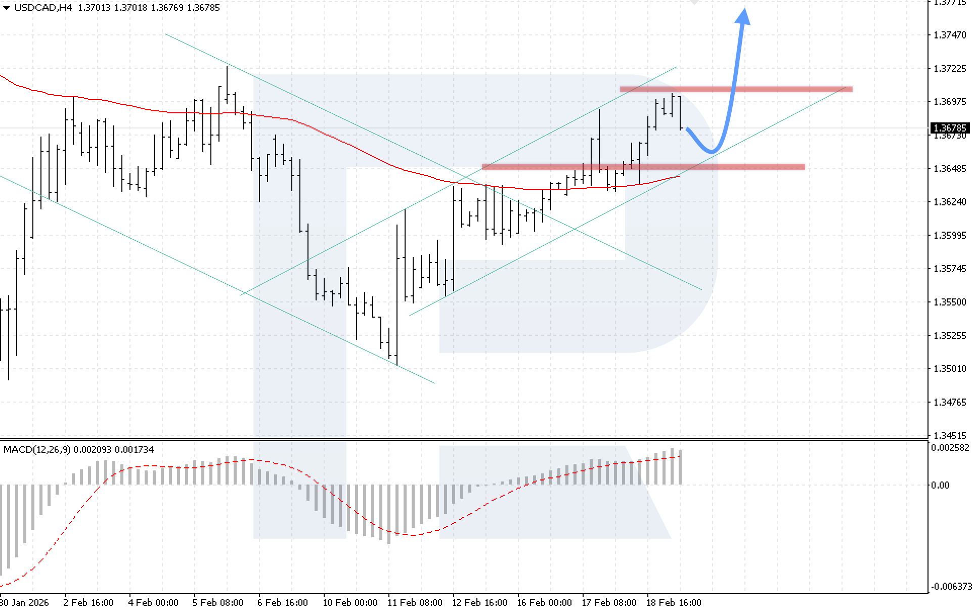 On the H1 chart of the USDCAD currency pair, the market continues to move within an upward momentum, while attempting to develop a correction. Today, 19 February 2026, the baseline scenario suggests further growth towards 1.3785 after a rebound from the lower boundary of the bullish channel.