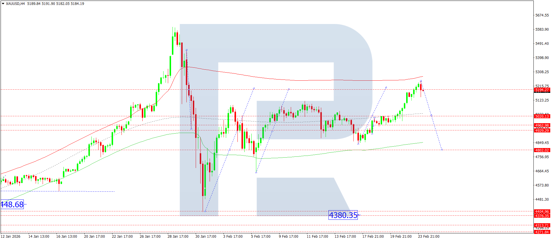 On the H4 chart of XAUUSD, the market completed a growth wave towards 5,240. Today, 24 February 2026, we expect the beginning of a decline towards 5,020. A breakout below this level would open the door for a move towards 4,800.
