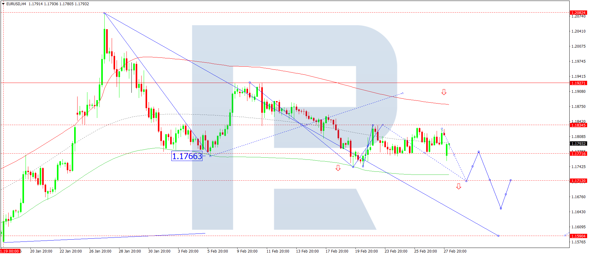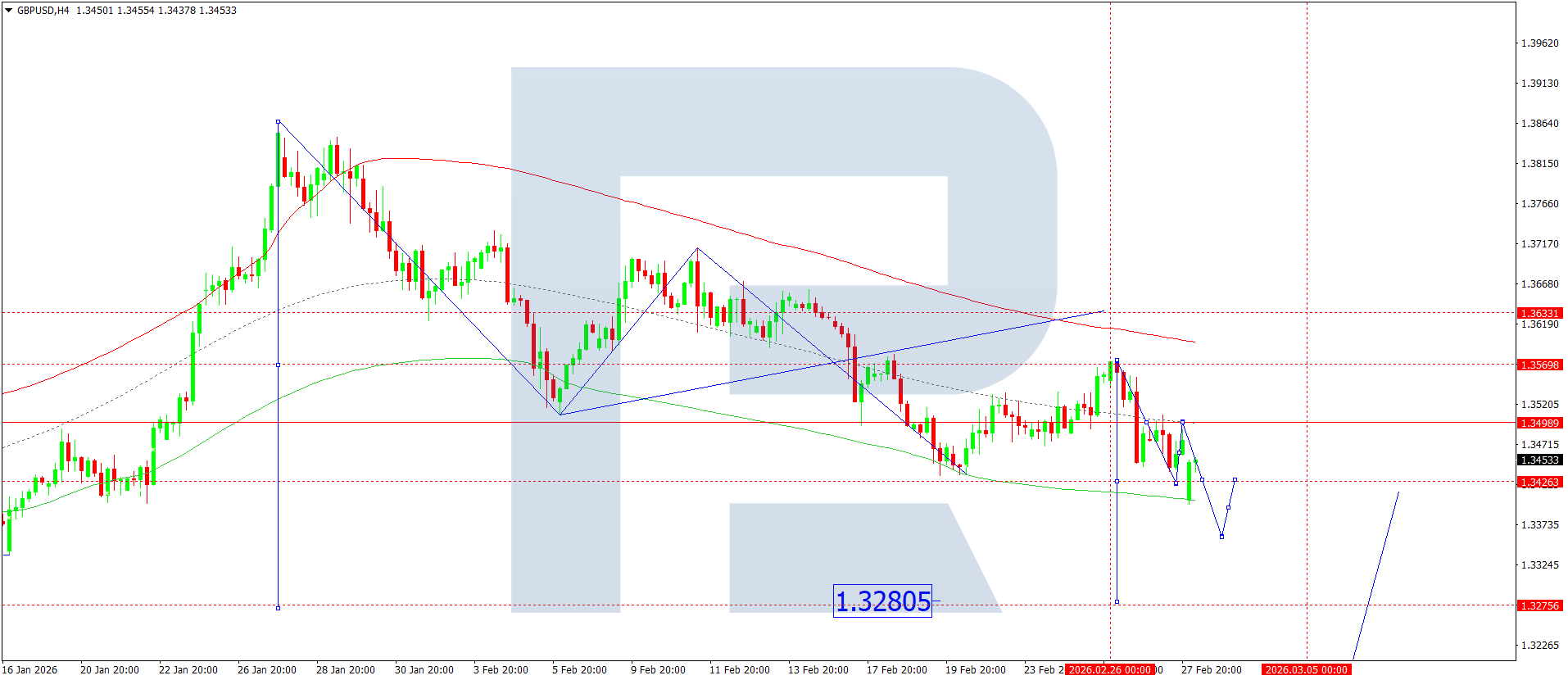 On the H4 chart of the EURUSD pair, the market broke below 1.1766 and continues to form a decline wave structure towards 1.1712. Today, 2 March 2026, this target level is expected to be reached. Further on, the probability of a correction towards 1.1771 will be considered. Then the trend may continue towards 1.1655. The target is local.
