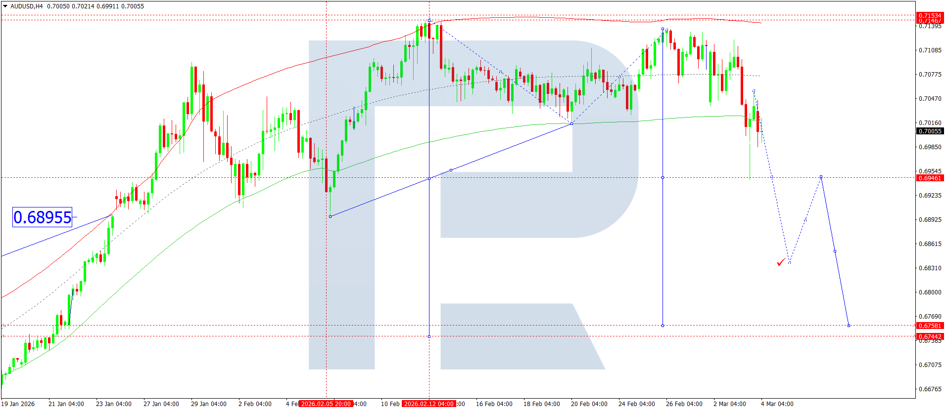On the H4 chart of the AUDUSD pair, the market broke below 0.704 and completed a downward wave, reaching 0.6940. Today, 4 March 2026, a correction towards 0.7055 has been completed, and the downward wave continues to 0.6848. Next, a consolidation range might form around this level before the pair dips to 0.6755, a local target.