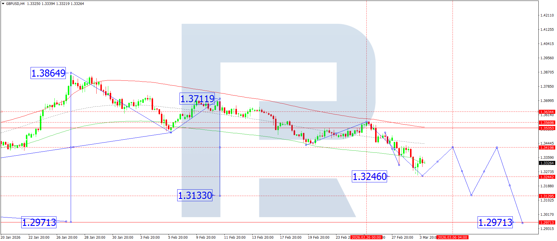 On the H4 chart of the GBPUSD pair, the market broke below 1.3380 and continues to form a wave structure towards 1.324, the first target. Today, 4 March 2026, this level is expected to be reached, followed by the beginning of a correction to 1.3420. Then a decline to 1.3133 is expected.