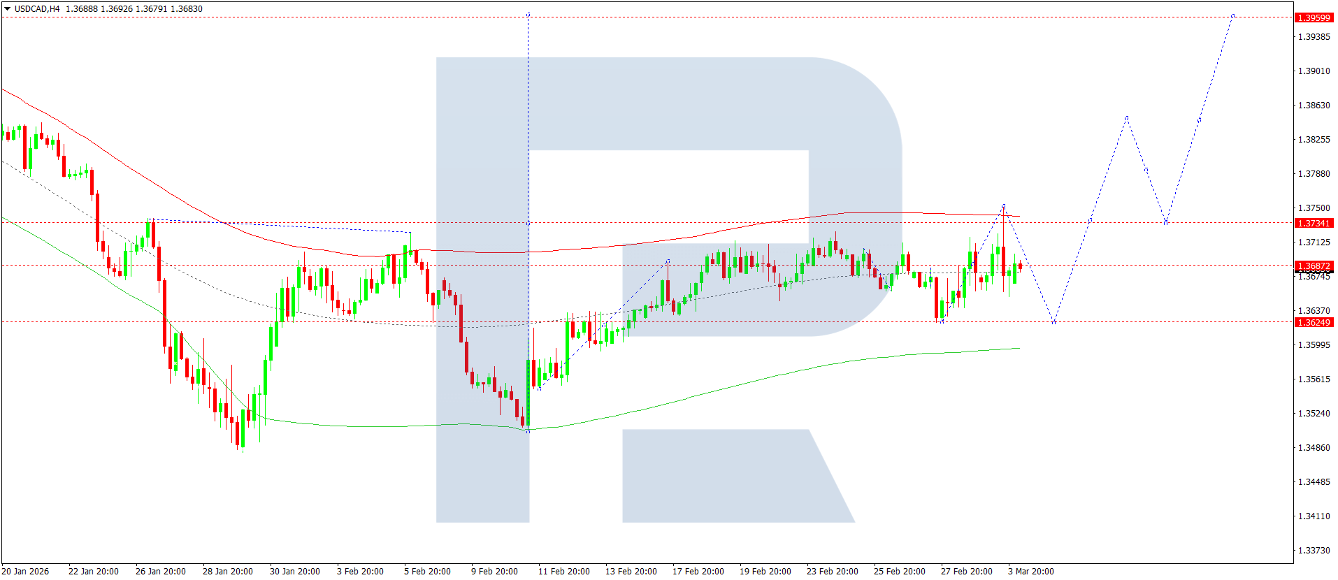 On the H4 chart of the USDCAD pair, the market completed an upward wave to 1.3750. Today, 4 March 2026, a corrective move to 1.3630 is possible. After this correction is completed, a breakout above 1.3737 is expected. This will open the potential for a wave to 1.3850, with prospects for continuation of the trend to 1.3950.
