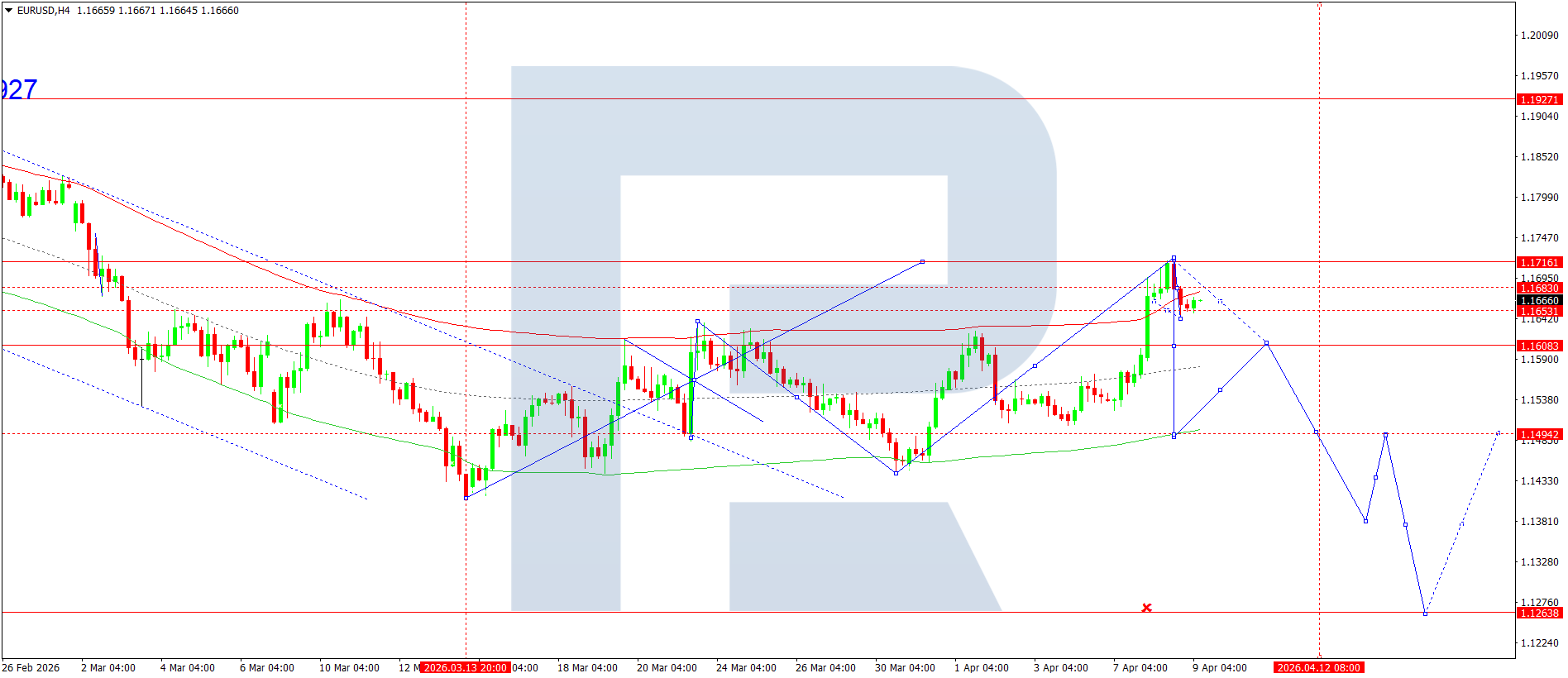 On the H4 chart of the EURUSD pair, the market formed a consolidation range around 1.1683 and broke out downwards. Today, 9 April 2026, a downward breakout is expected. A downward wave towards 1.1606 is likely to begin. Subsequently, the pair is expected to rise to 1.1653 before declining to 1.1494.