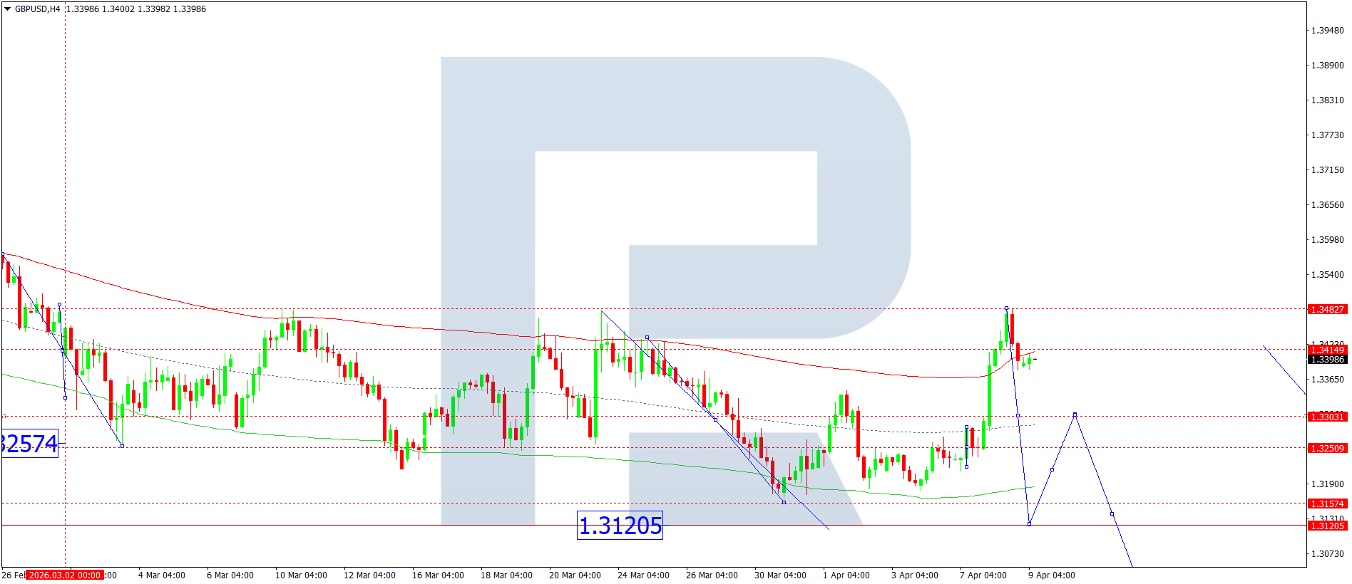 On the H4 chart of the GBPUSD pair, the market formed an upward wave to 1.3482. Today, 9 April 2026, a consolidation range is expected to develop below this level. A downward breakout would open the potential for a decline to 1.3303 and possibly further to 1.3120.