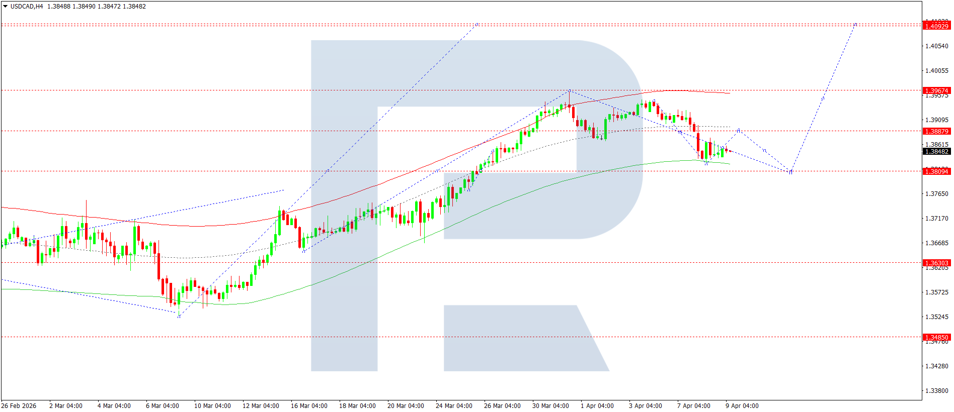 On the H4 chart of the USDCAD pair, the market completed a downward structure, reaching 1.3938. Today, 9 April 2026, a consolidation range is expected to develop above this level. A downward breakout would open the door to a decline towards 1.3808. Conversely, in case of an upward breakout, the price is expected to climb to 1.3888.