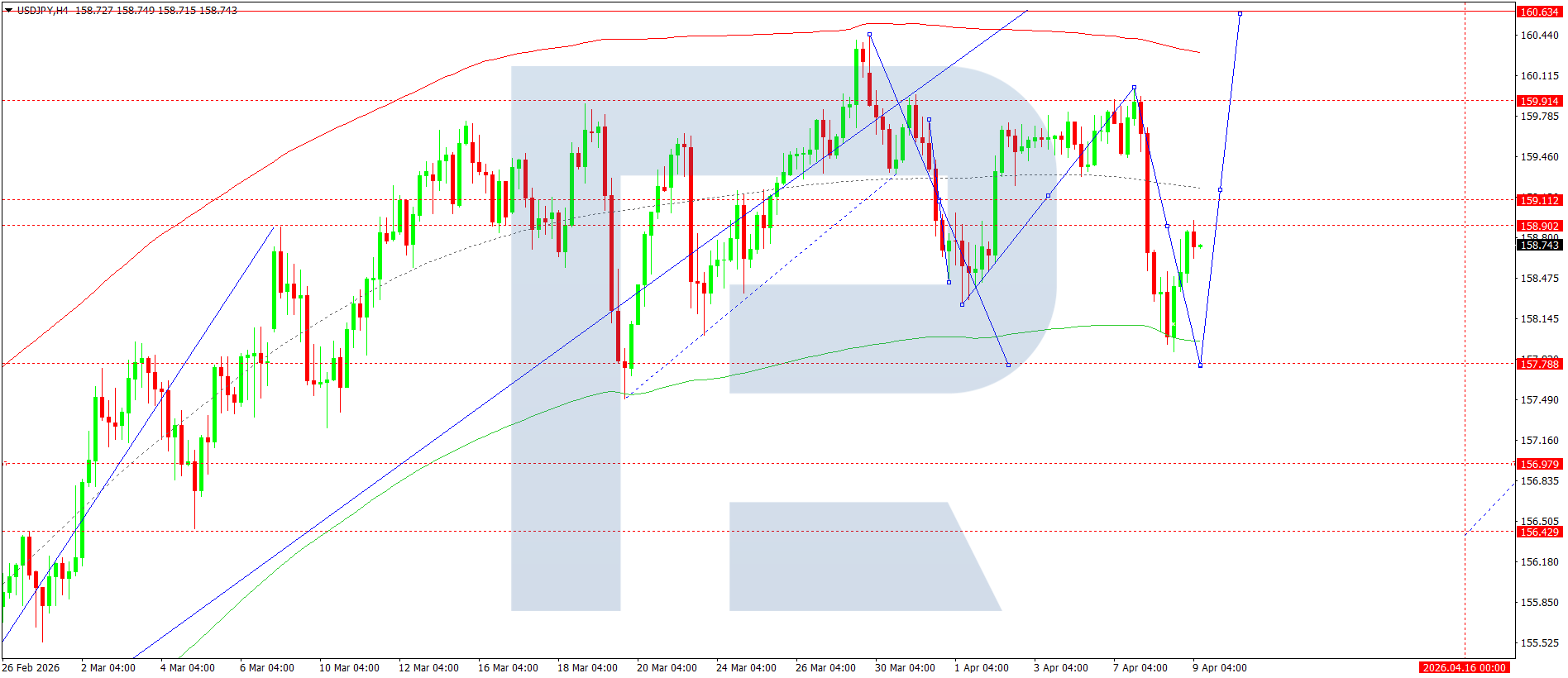 On the H4 chart of the USDJPY pair, the market completed a downward wave, reaching 158.90. Today, 9 April 2026, an upward move is expected. Subsequently, an upward wave could begin, aiming for 158.90 and potentially continuing towards 159.11.