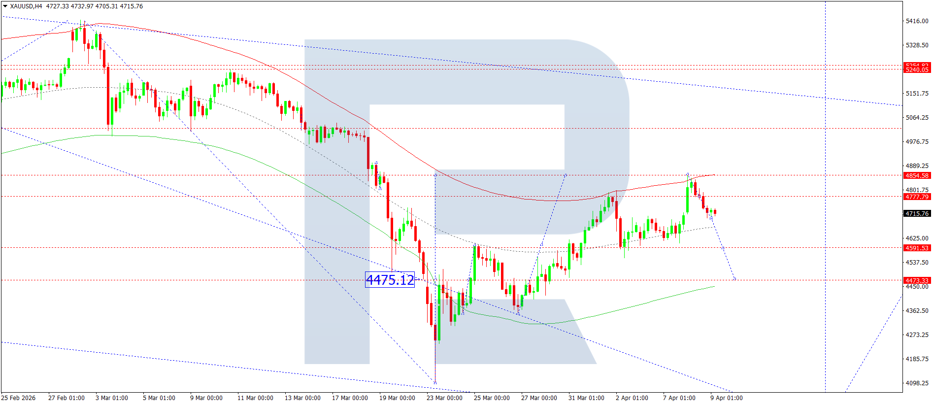 On the H4 chart of XAUUSD, the market completed an upward wave, reaching 4,854. Today, 9 April 2026, a consolidation range is expected to develop below this level. An upward breakout would open the way for growth to 5,000 and potentially higher to 5,045. Alternatively, a downward breakout could trigger another downward move to 4,477, a local target.