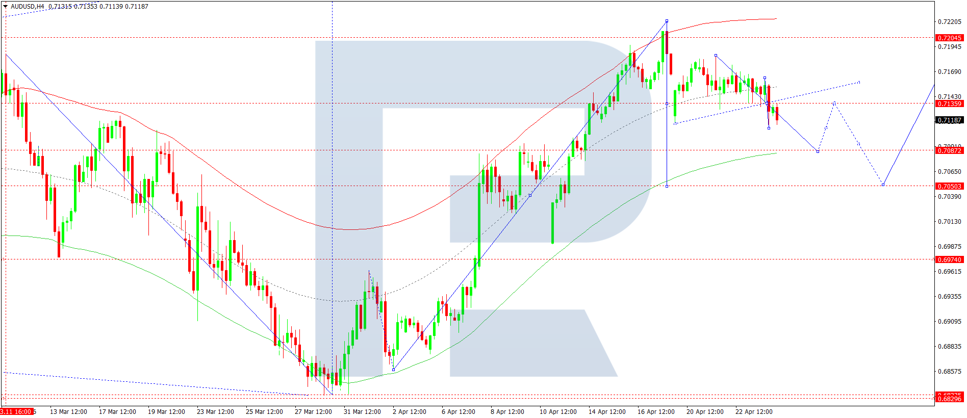 On the H4 chart of the AUDUSD pair, the market formed a consolidation range around 0.7135. Today, 24 April 2026, a breakout below the range would open the potential for continued downward movement towards 0.7082, with prospects for further decline to 0.7050.
