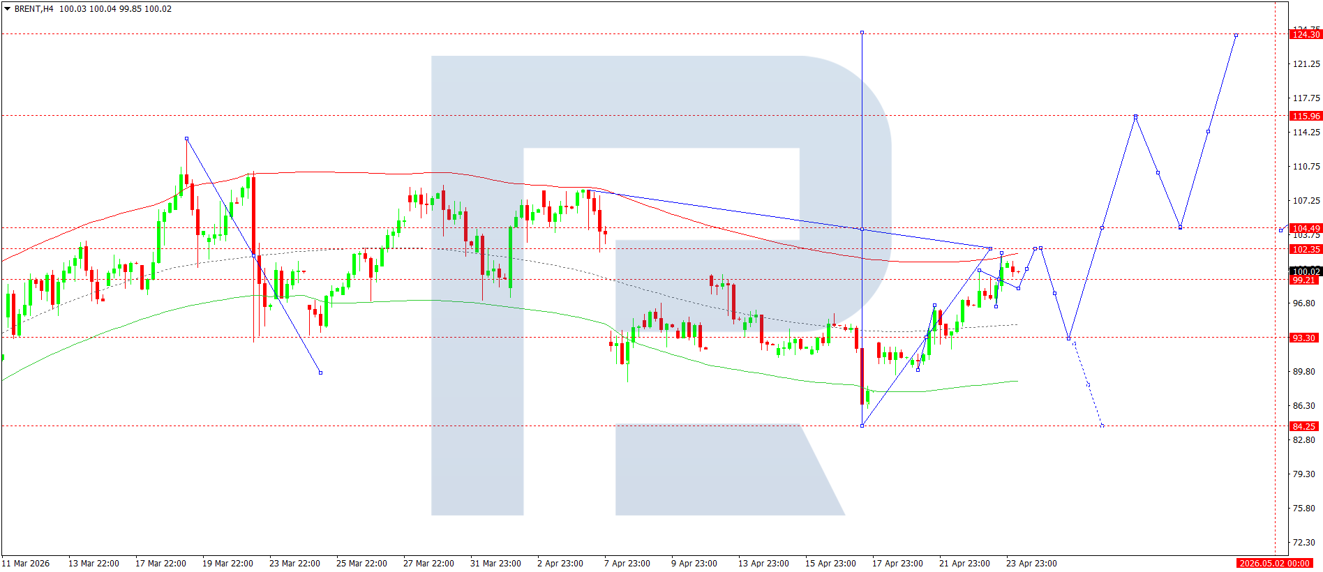 On the H4 chart of Brent crude oil, the market completed a growth structure to 101.89, followed by a decline to 99.49. Today, 24 April 2026, an upward move to 102.60 is possible, with a consolidation range forming below this level. An upward breakout from the range would open the door for growth to 115.96, with prospects for continuation of the trend to 124.30, a local target. Alternatively, a downward breakout could trigger another corrective move towards 93.30. Subsequently, growth to 115.96 is expected.