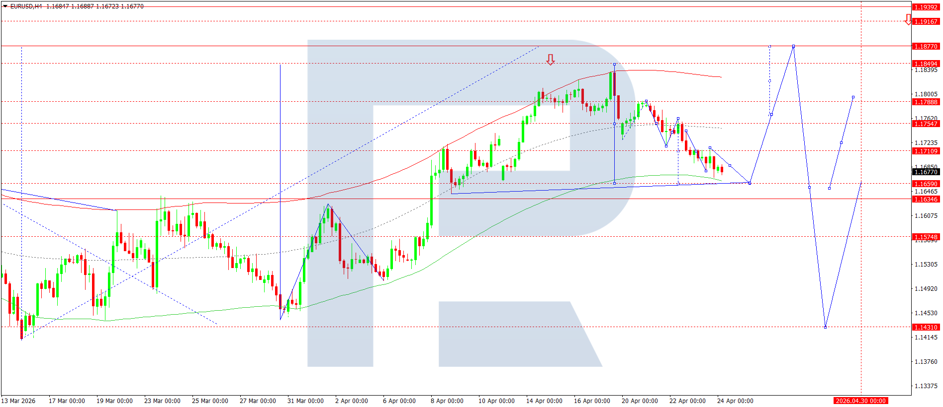 On the H4 chart of the EURUSD pair, the market broke below 1.1710 and continues to develop a wave towards 1.1659, a local target. Today, 24 April 2026, the price is expected to reach this target level, with a consolidation range starting to develop around it. A downward breakout from the range will open the potential for continued movement towards 1.1626. Subsequently, an upward move to 1.1760 cannot be ruled out.