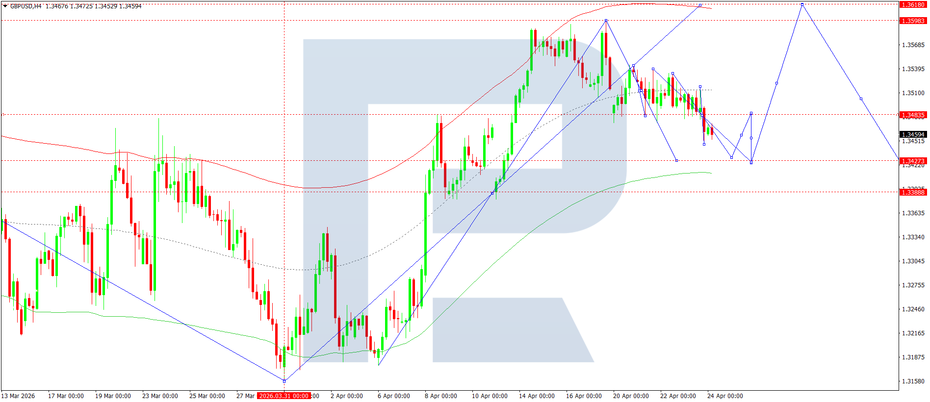 On the H4 chart of the GBPUSD pair, the market continues to develop a consolidation range around 1.3485. Today, 24 April 2026, the price is expected to break below the range, opening the potential for a decline to 1.3427, with prospects for continuation of the trend to 1.3388.