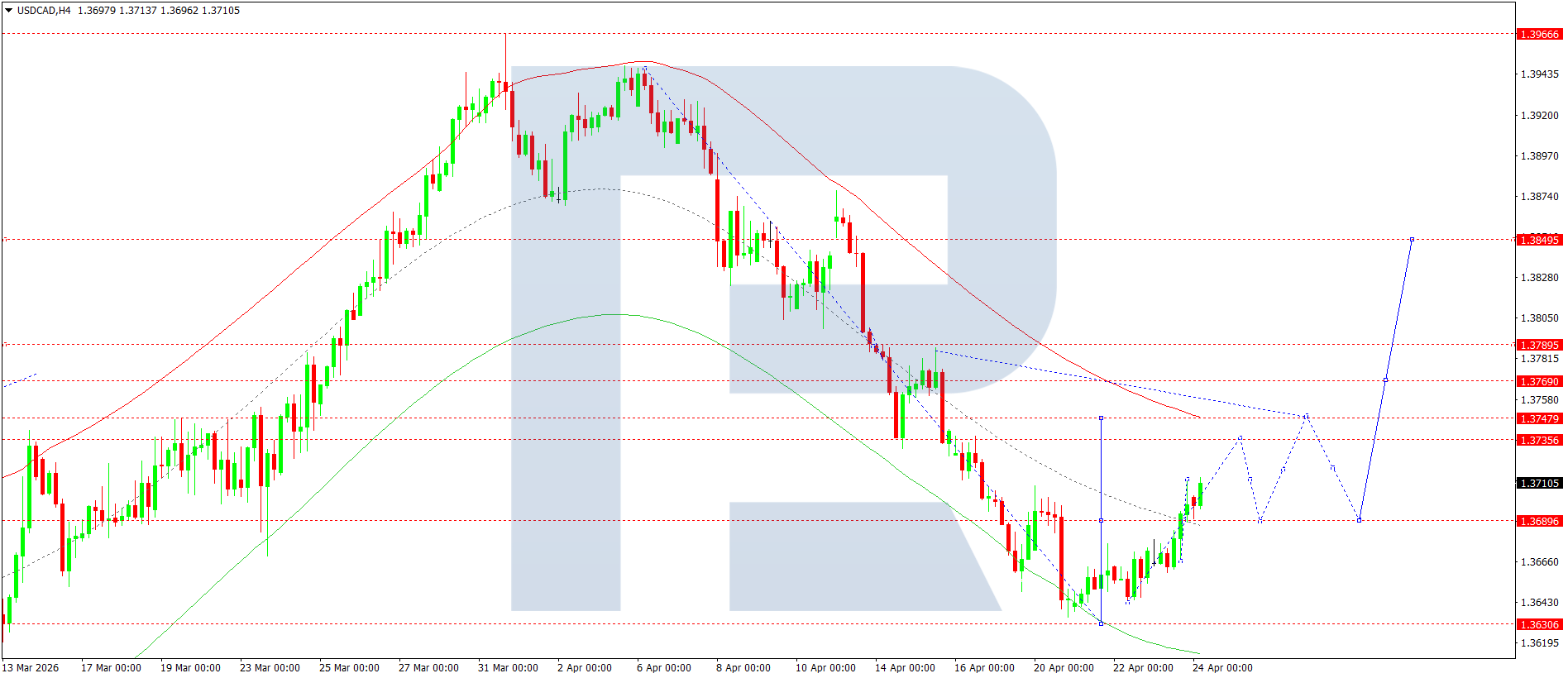 On the H4 chart of the USDCAD pair, the market completed a downward structure to 1.3686. Today, 24 April 2026, a consolidation range has formed above this level. An upward breakout from the range would open the way towards 1.3735. Subsequently, the price is expected to decline to 1.3686 before rising to 1.3750 and possibly further to 1.3789.